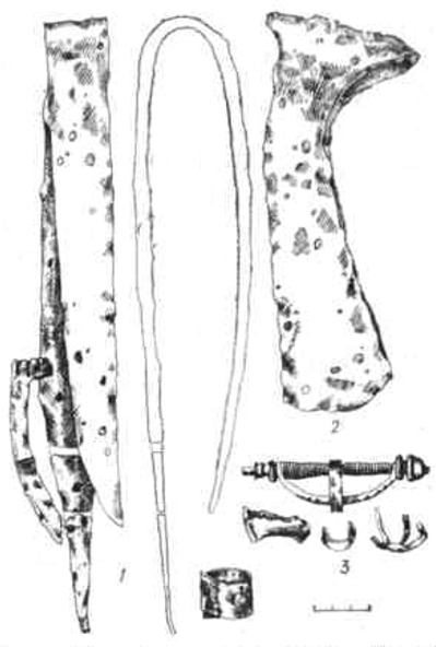 Рис. 41. Инвентарь погр. № Е VI! в. с трупосожжен нем из могильника Плннкайгалнс: 1 — однолезвнйный меч. согнутый в ритуальных целях; 2 — узколезвийный проушный топор; 3 — фрагменты арбалетовидной бронзовой фибулы с тесло-видной ножкой |