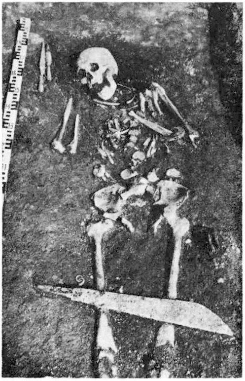 До последнего десятилетия большинство широких боевых ножей-мечей (рнс. 42) обнаружено случайно и лишь несколько десятков экземпляров – в погребениях. Из-за многочисленности случайных находок оружия этого вида долгое время не была точно ясна ни его хронология, ни связанные с ним закономерности погребального обряда, ни территория его распространения. В результате накопления большого количества материала стало возможным картографировать его, уточнить хронологию и установить, в каком порядке эти мечи клали в погребения на отдельных территориях (123, с. 124-125, карта 69).