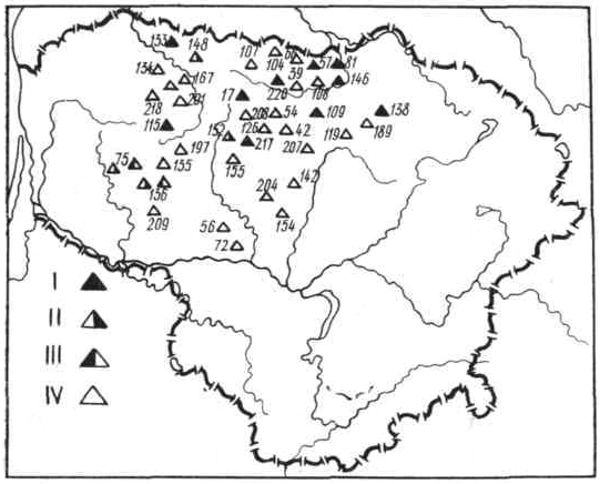 Двухлезвнйные мечи обнаружены в Крикштони-се (Лаздийскнй р-н), в погребении № 1, под насыпью кургана с каменным венцом, размытого Нямунасом (105, с. 76, ри-с. 5; 112, с. 314), и в Таурапилисе, в кургане № 5 (190, с. 129-136, рис. 2; 193, с. 23-25) (рис. 37: I, 2). Особенно много найдено однолезвийных мечей с рукоятками без перекрестий (рис. 37:3-8), они найдены в 32 погребальных памятниках (карта XVI). Например, в грунтовом могильнике Паланга из 37 найденных в погребениях мечей 18 были упомянутого типа. Большинство из них датируются VIII-IX вв.* (99, с. 46). В могильнике Лаздининкай, в погребениях VI-IX вв., найдено 26 однолезвийных мечей. В Кяулейкском могильнике 9 мужских погребений VIII -начала IX в. имели по одному оружию этого вида (62, с. 120). По несколько экземпляров известно из раскопок могильников Вилку Кампас (141, с. 49), ГІрншманчяй (139, с. 56; 144, с. 87-97, рис. 14, 15:5), Юргайчяй (142, с. 106). Единичные экземпляры обнаружены в могильниках Бикавенай (Шилутский р-н), в Па-кальнншкяй (Шакяйский р-н), в Плинкайгалисе, в погребении № Е, в Янкайчяй (Тельшяйский р-н), в Яунейкяй и Жвиляй (Шилальский р-н), Варлншкес (Тракайский р-н) (рис. 38). Таким образом, в послевоенные годы на территории республики обнаружено около 80 однолезвийных и 2 двухлезвийных меча I тысячелетия н. э.