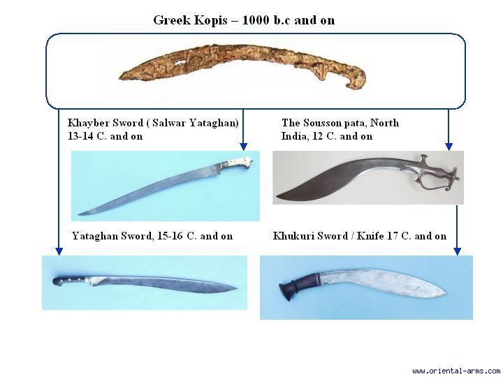 Некоторые адепты этой теории даже составляют своего рода схемы, наглядно показывающие связь некоторых видов восточного оружия с древнегреческим кописом.