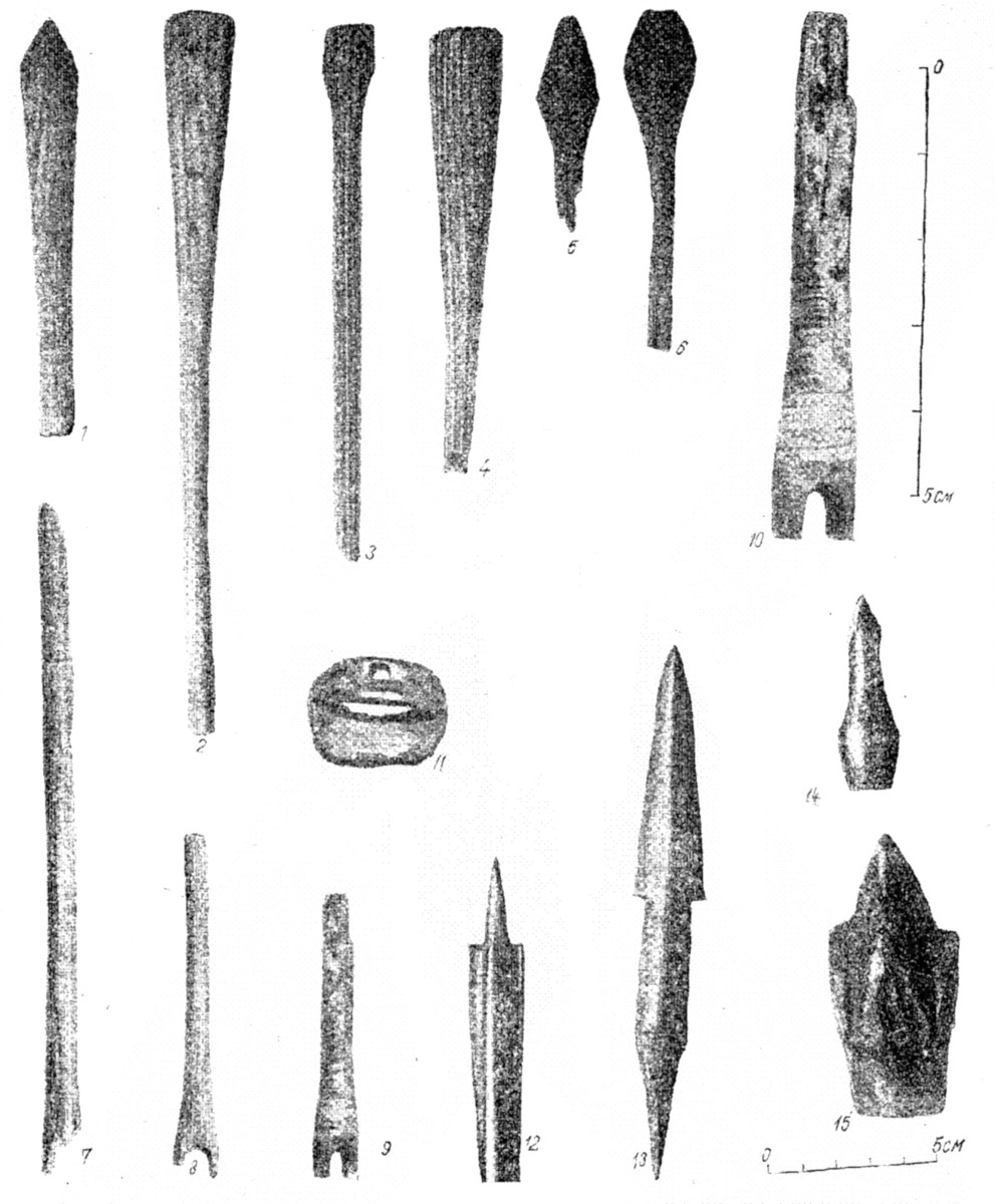 1-5 – обломки деревянных охотничьих и детских стрел Х–ХII вв.; 7-9 – обломки древок стрел XI-XIV вв. с вырезами для тетивы: 10 – увеличенный обломок древка стрелы со следами склейки оперения; 11 – костной струг XII в. для шлифования деревянных рукоятей ножей и других предметов; 12-14 – костяные наконечники стрел XII в.; 15 – костяное навершие знамени XI в.