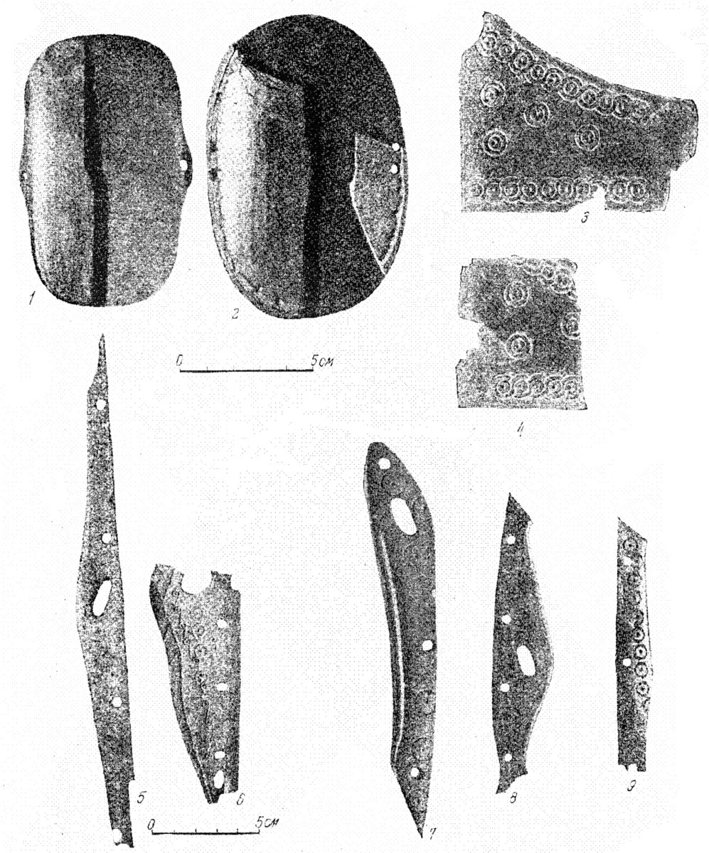 | 8 | Накладка от налучья с циркульным орнаментом | Там же, 12-679 | 16 | XII, вп | 93 | 43-76 | 1 | – | 11,3 |