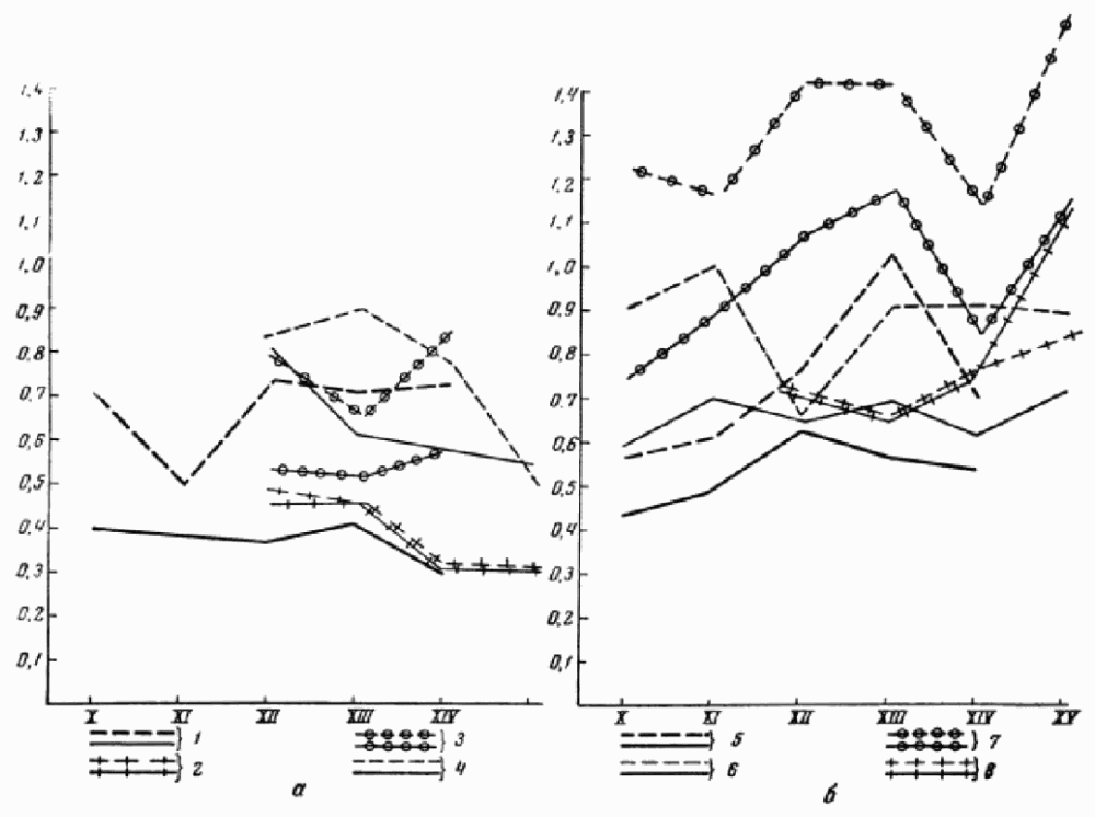 Мы составили графики (рис. 10) колебания средних толщин пряжи раздельно для тканей импортных и местных новгородских. Средняя толщина нити пряжи выражена в миллиметрах. Среди тканей импортных мы выделяем ткани специальные и суконные первого, второго, третьего и четвертого сортов, среди тканей местных ажурные ткани и обычные ткани первого, второго, третьего и четвертого сортов.