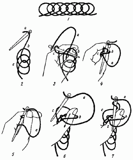 Рис. 29, 2 показывает следующий этап переплетения, когда нить уже иглой протягивается сверху по направлению ладони через петлю б. Затем нить загибается концом иглы на 90° вверх, так, что петля б остается завернутой на острие иглы, проходящей через середину петли б под участком нити, обозначенной буквой а. В это время большой палец левой руки всовывается в петлю б так, как это показано на рис. 29, 3, после чего игла проходит параллельно большому пальцу острием к его основе. При этом конец большого пальца высовывается из петли для придержания нити на игле (рис. 29, 4). Большой и указательный пальцы правой руки осторожно тянут нитку а, пока петля б не обнимет иглу ниже ушка. Протягивание иглы через наложенные на нее петли происходит так, чтобы на большом пальце левой руки осталась петля, возникшая из нити а, которая эквивалентна петле б. Рис. 29, 6 представляет следующую стежку. На большом пальце левой руки имеется петля б. Игла проходит между большим пальцем и петлей б. После выполнения ободка варежки каждая следующая вереница петель соединялась с предыдущей.