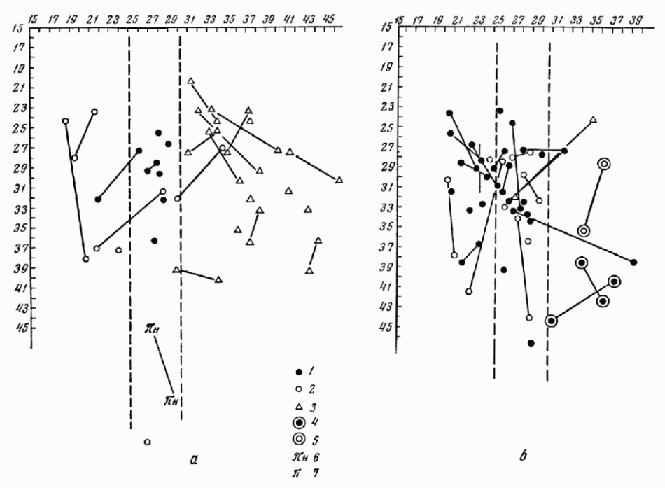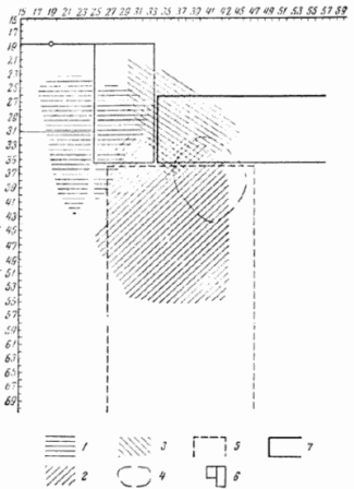 1 — полигон шерсти суконных тканей; 2 — полигон шерсти «обычных» и ажурных тканей, а также поясов и ниток; 3 — полигон шерсти тканей «специального» типа; 4 — полигон шерсти из летго-литовских курганов (по Яворскому); 5 — границы толщины и равномерности шерсти современной местной овцы (по Т. И. Кузнецову); 6 — границы толщины и равномерности современной тонкой и полутонкой однородной шерсти (по Т.И.Кузнецову); 7— границы толщины и равномерности современной однородной грубой и полугрубой шерсти (по Т. И. Кузнецову)