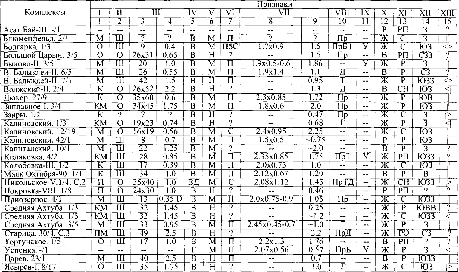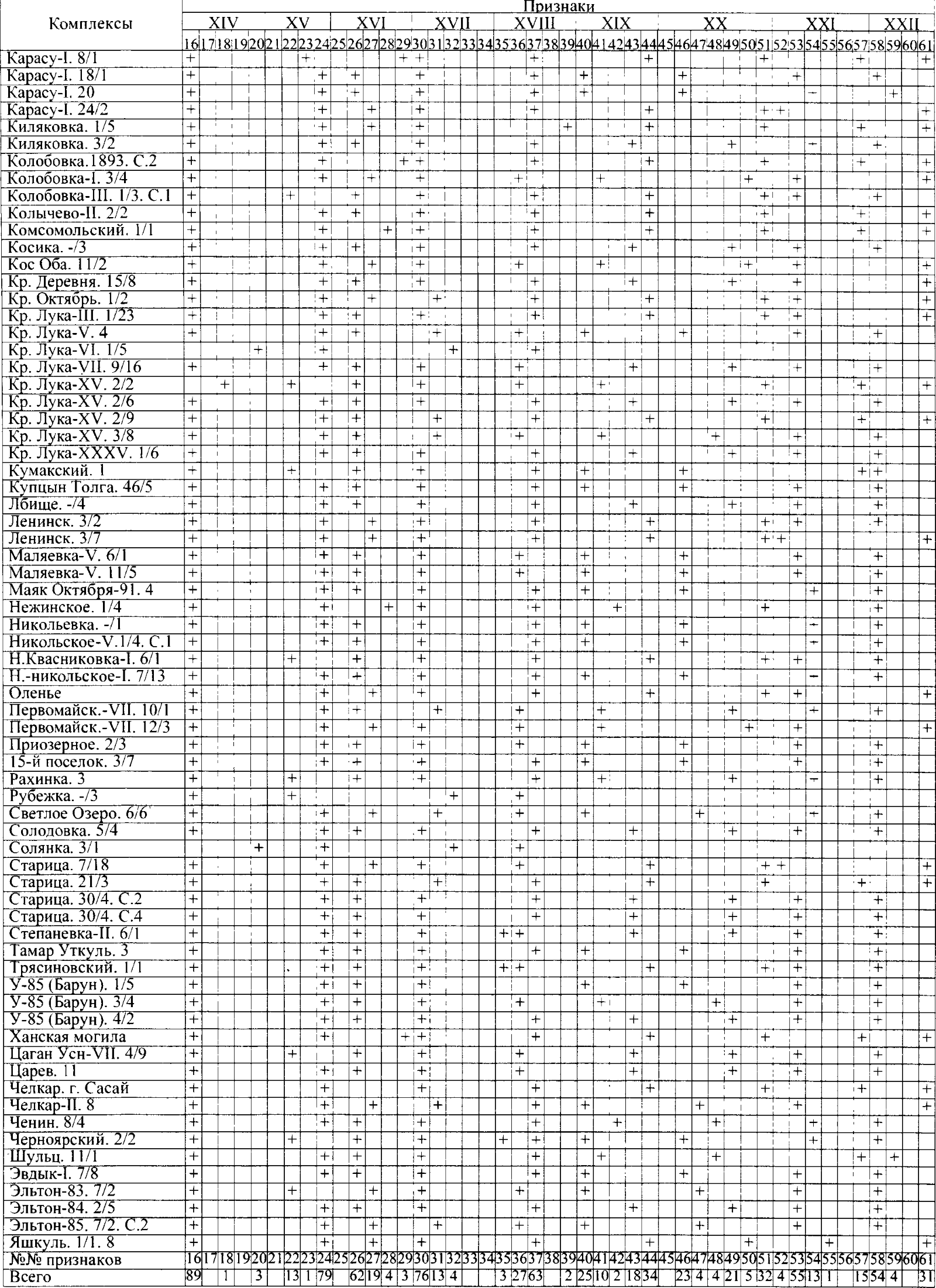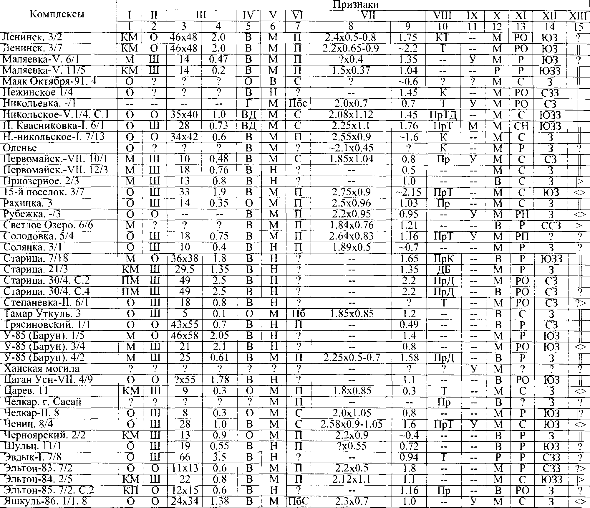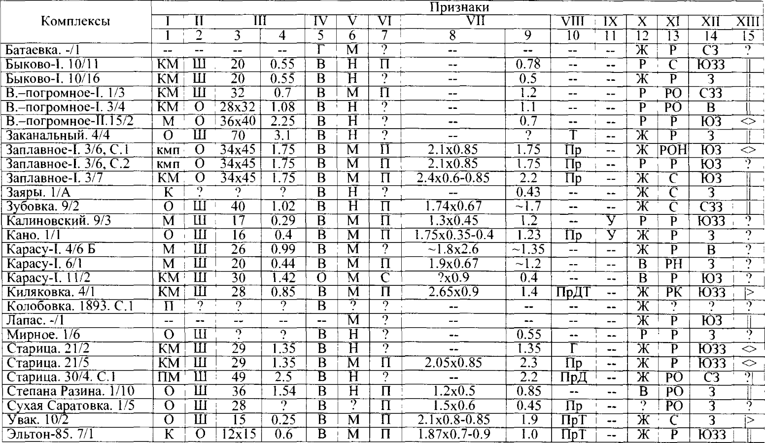 Данная программа разрабатывается автором с 1989 г. (Круглов Е.В., 1989а) для всех памятников средневековых кочевников Северного Прикаспия VII-XI вв., в том числе для захоронений хазар, и в предлагаемом виде не учитывает только культовые поминальные и погребально-поминальные сооружения VII-VIII вв. (т.н. курганы с внутренними ровиками), поскольку памятники такого рода у огузов и печенегов не известны. В таблицах учтен практически весь имеющийся материал средневековых кочевников степной части Северного Прикаспия 2-й пол. IX - 1-й пол. XI в., кроме нескольких комплексов: Маяк Октября, 3/3 (раскопки Лукашова А.В.), Яман, 2 (раскопки Мажи-това Н.А.), Атпа-И, 2 (раскопки Гуцалова С.Ю.), данные о которых нам неизвестны. Таблицы составлены в рамках проекта по изданию Свода археологических памятников огузо-печенегов на территории Северного Прикаспия*.