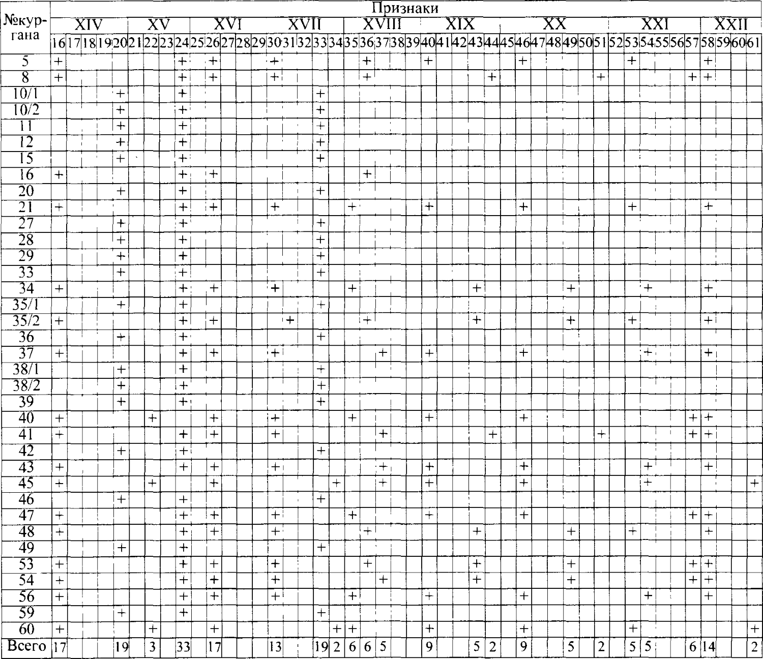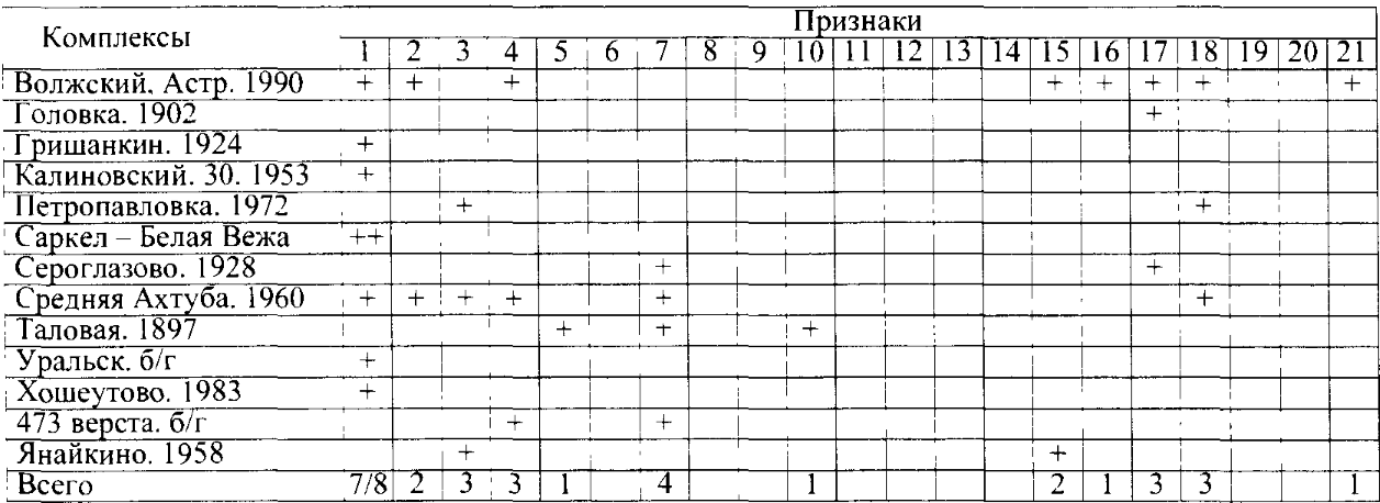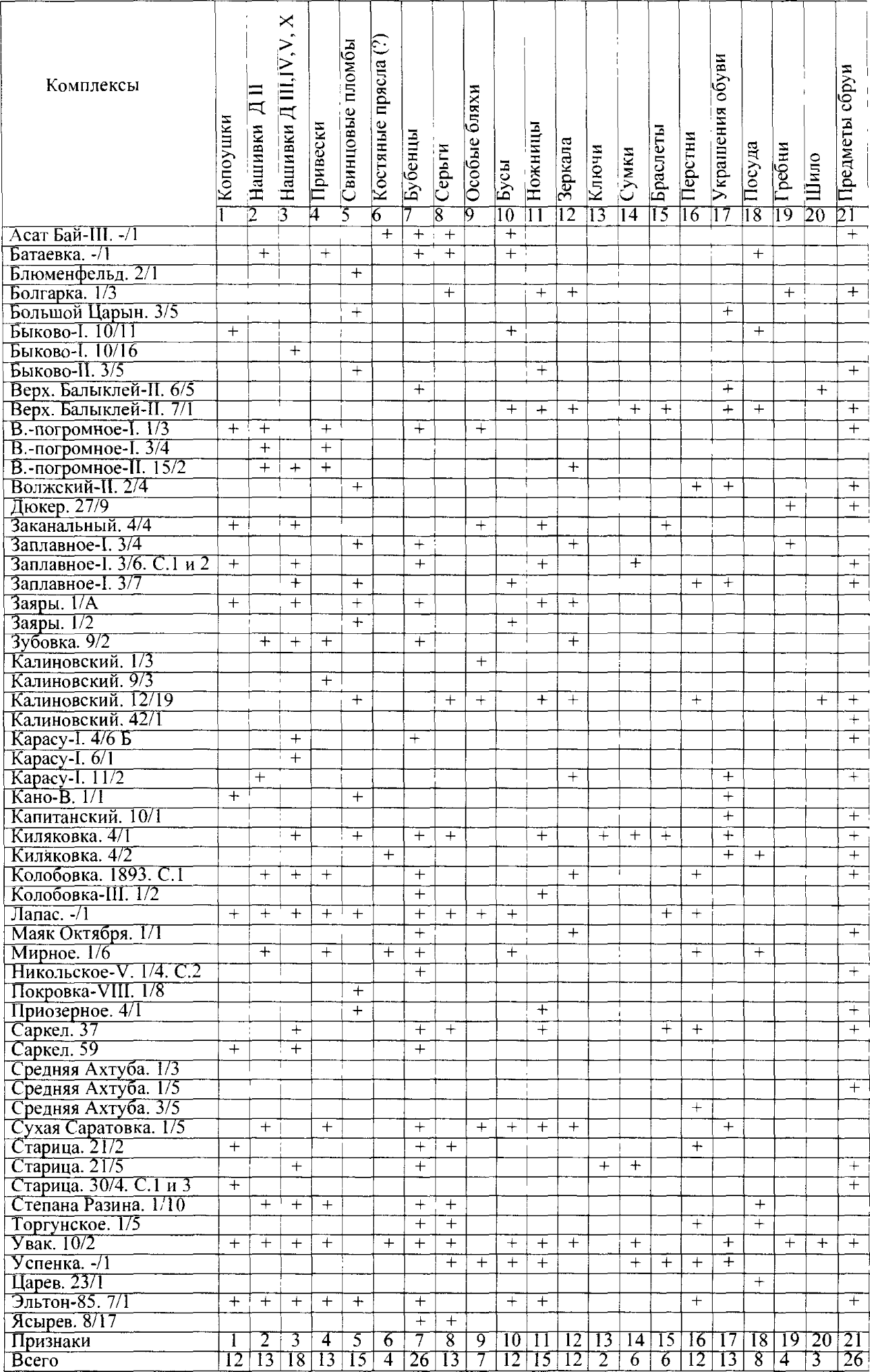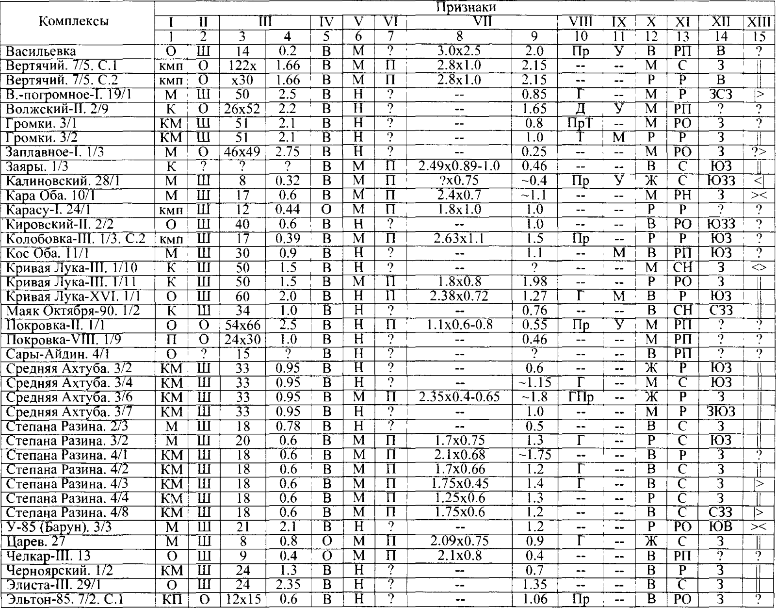 Данная программа разрабатывается автором с 1989 г. (Круглов Е.В., 1989а) для всех памятников средневековых кочевников Северного Прикаспия VII-XI вв., в том числе для захоронений хазар, и в предлагаемом виде не учитывает только культовые поминальные и погребально-поминальные сооружения VII-VIII вв. (т.н. курганы с внутренними ровиками), поскольку памятники такого рода у огузов и печенегов не известны. В таблицах учтен практически весь имеющийся материал средневековых кочевников степной части Северного Прикаспия 2-й пол. IX - 1-й пол. XI в., кроме нескольких комплексов: Маяк Октября, 3/3 (раскопки Лукашова А.В.), Яман, 2 (раскопки Мажи-това Н.А.), Атпа-И, 2 (раскопки Гуцалова С.Ю.), данные о которых нам неизвестны. Таблицы составлены в рамках проекта по изданию Свода археологических памятников огузо-печенегов на территории Северного Прикаспия*.
