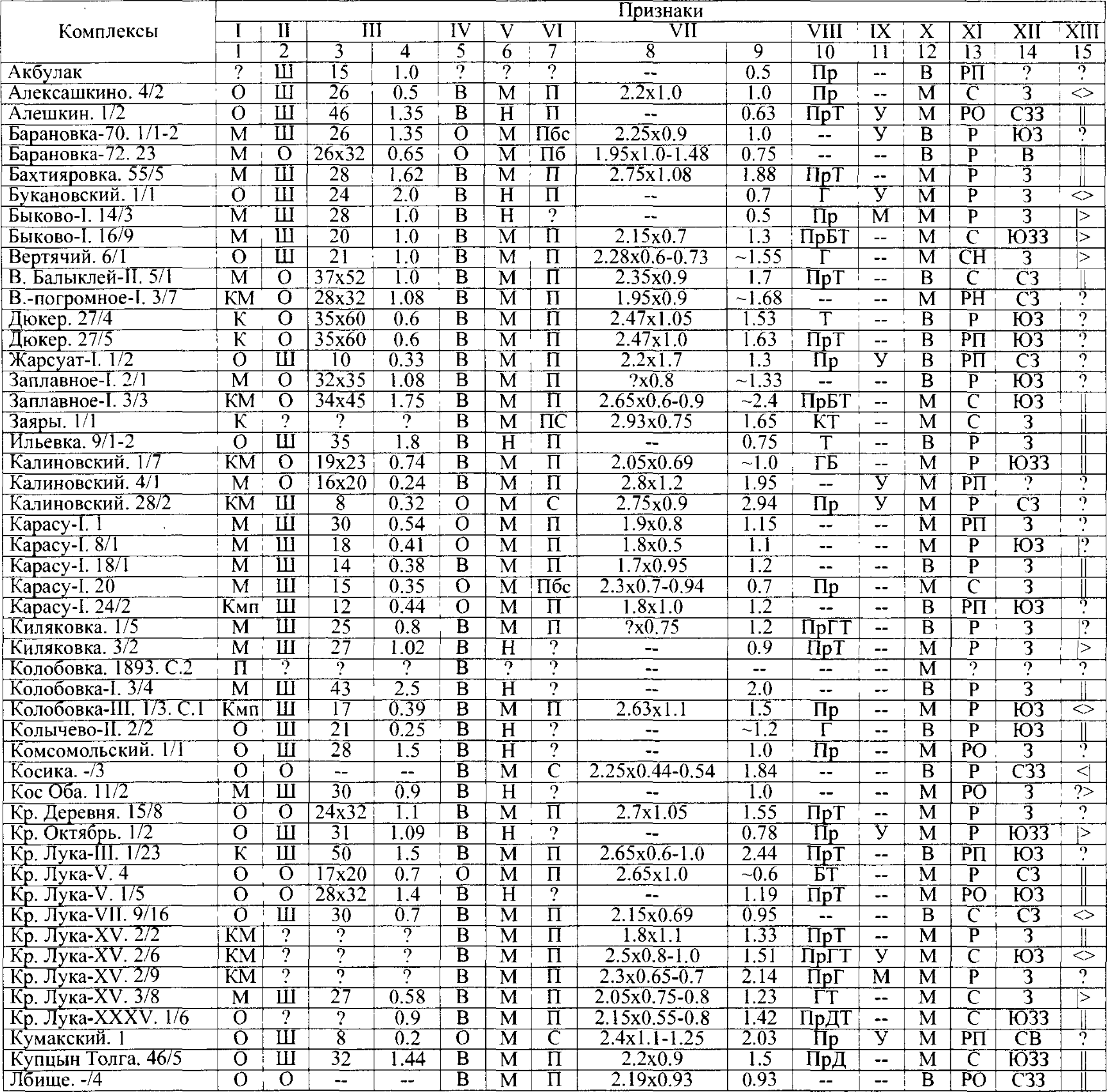 1. Одиночное /О/, несколько однокультурных захоронений в одном кургане /К/, в одном могильнике /М/, в одном погребении /П/, нет данных /—/.