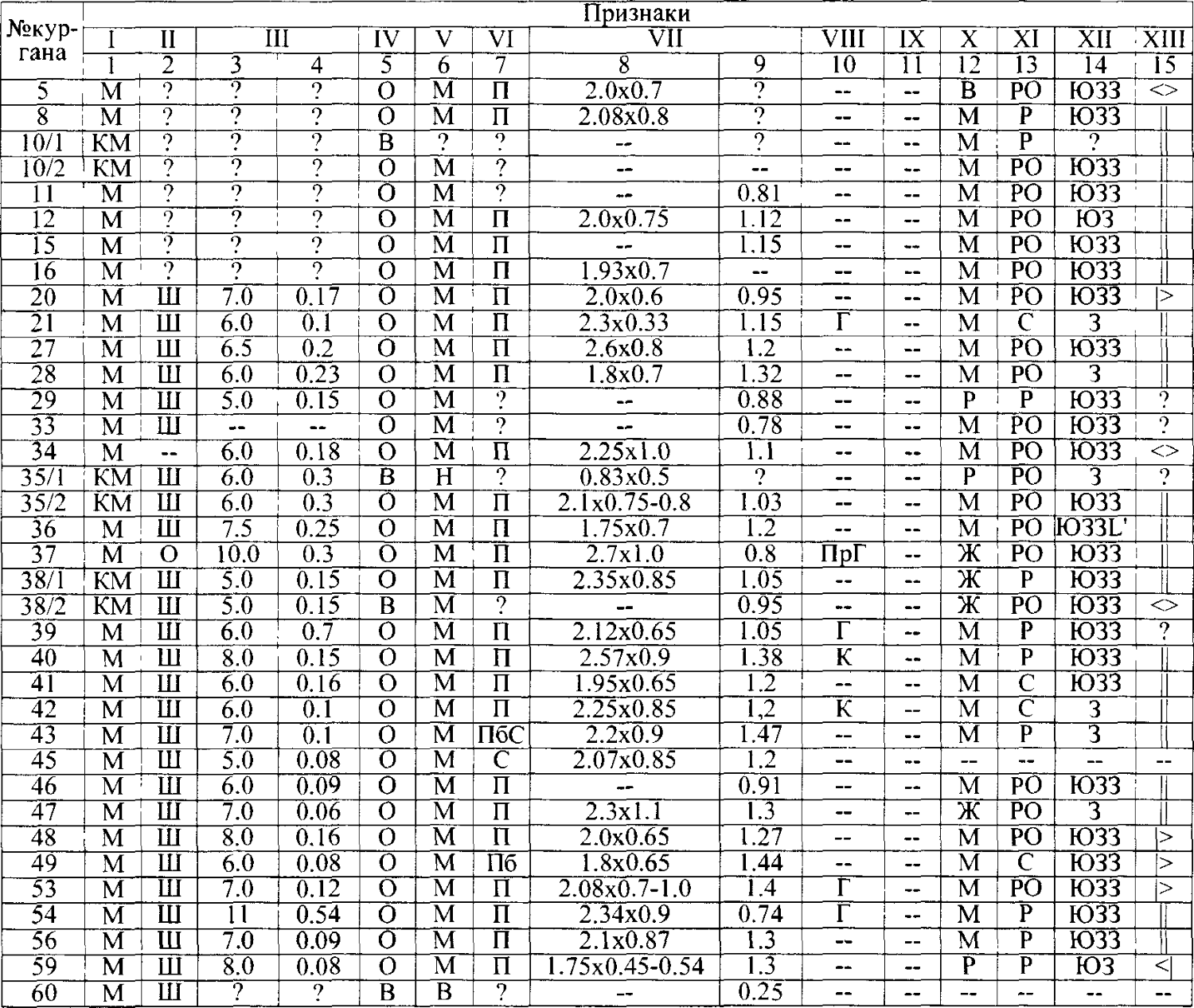 1. Взрослый, пол не установлен /В/, мужчина /М/, женщина /Ж/, ребенок, подросток /Р/. Описание каждого конкретного скелета приводится индивидуально, в соответствующих строках таблиц.