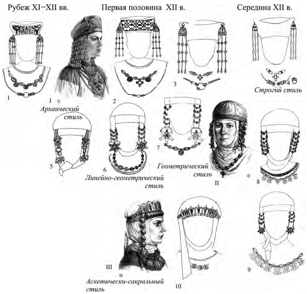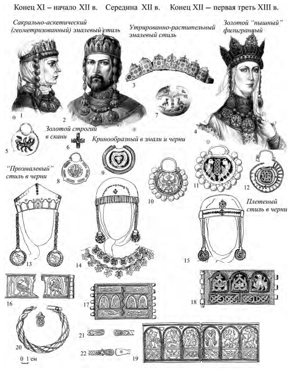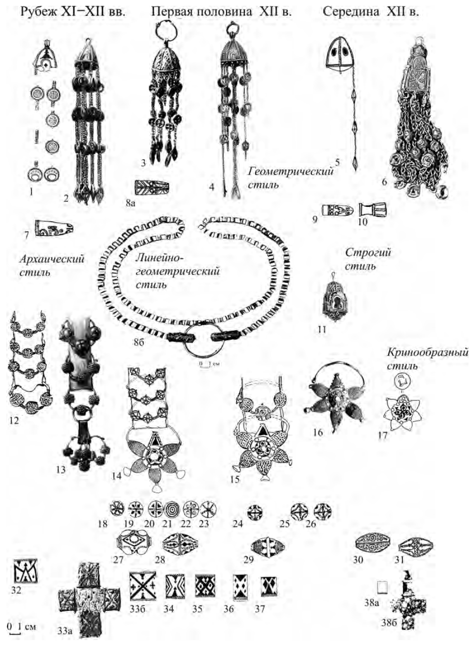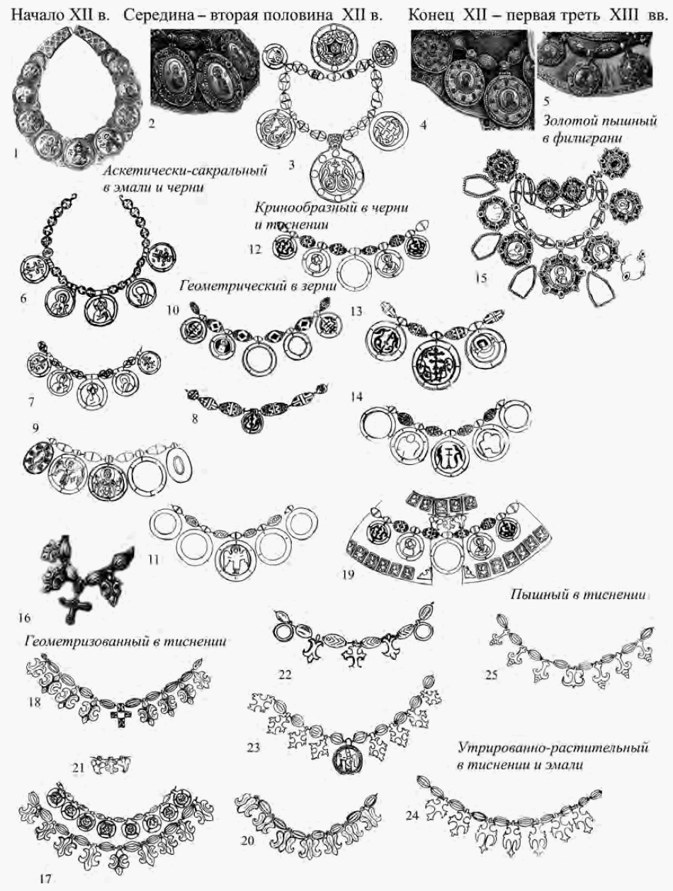 Таким образом, начало XII в. связано с сакрально-аскетическим (геометризованным) стилем в эмали и черни и тиснении, строгим – в скани, остатками линейно-геометрического стиля в зерни. Середина столетия связана с кринообразным стилем в эмали, черни и тиснении, геометрическим в зерни. В конце XII и первой трети XIII в. развивается утрированно-растительный стиль в эмали, плетеный в черни, пышный стиль в филиграни. Каждому стилю соответствуют определенные типы украшений.
