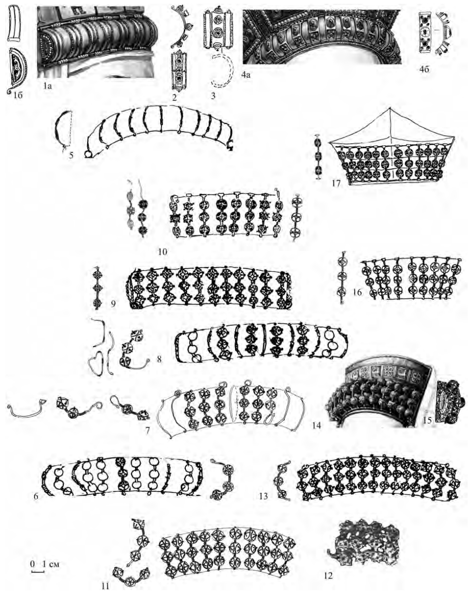 Во-вторых, под воздействием дужек эмалевого убора трехбусинные височные кольца трансформируются в дужки очелья и используются также для рясенных лент (рис. 13). Многие скано-зерненые очелья демонстрируют процесс приспособления колец под дужки: снятие бусин, подрубание одного из концов или образование из него грубой петли (рис. 13: 5-11). В итоге возникает новая категория – трехбусинная дужка с двумя аккуратными петлями по концам для очелья или височной ленты (рис. 13: 12-17). Прямые трехбусинные стержни с двумя петлями могли соответствовать двум головным уборам: кокошнику и пирамидальному убору провизантийской формы, известному по изображениям на самих же колтах (рис. 13: 9,10,16,17). Можно предполагать, что древнерусский кокошник складывается к концу XII в. Бусины трехбусинных украшений переходят к легкой ажурной конструкции (рис. 12: 10, 11).