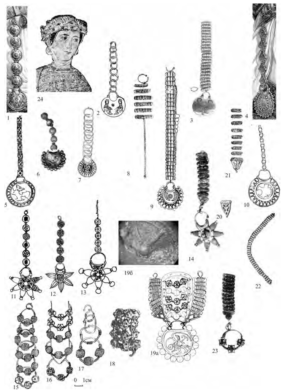 Наиболее ранний стиль эмалевого убора можно определить как аскетически-сакральный по аналогии с одним из основных направлений в византийской эстетике (Бычков 1991: 99, 147). Манера изображения отличается геометризованностью. Этот стиль имеет два направления: сакральное с преобладанием христианских сюжетов и светское, где используются зооморфные и фантастические образы, связанные с феодальной символикой. Ориентировочная дата стиля с конца XI по середину XII в. (рис. 11: 1, 2, 5). Следующий стиль можно определить как кринообразный. В рамках первых двух стилей господствует тип эмалевого колта с жемчужной обнизью, представленный на рис. 11: 5 (Макарова 1975: 22-26). Развитием кринообразного стиля в эмалевом уборе является утрированно-растительный с оттянутыми изгибами стеблей, относящийся к концу XII – первой трети XIII в. (Рыбаков 1987: 595). Формы лун-ничных колтов становятся не строго округлыми, а более широкими (рис. 11: 3, 7).