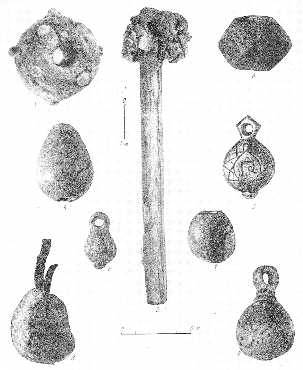 1 – навершие 6улавы XIII в. из капа с массивными гзоздями; 2 – булава XIII в.-начала XIV в; 3 – железное навершие булавы XIII в.; 4 – костяная гирька кистеня X в.; 5, 6 – бронзовые гирьки кистеней XI в.; 7 – свинцовая рукоятка кистеня XIV в.; 8  – костяная гирька кистеня конца XI в. или начала XII в. с остатками ремешка; 9 – металлческая гирька кистеня середины XII в. с железным стержнем и медным корпусом, налитым свинцом.