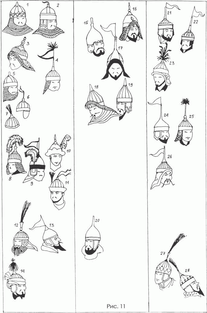 Большинство воинов на миниатюрах имеют шлемы, которые, не смотря на кажущееся разнообразие форм, легко распределяются по трем основным типам: низкие сфероконические "шишаки" (табл. 11: 1-14), высокие, крупные и объемные "шеломы" (табл. 11: 15-20) и шлемы с цилиндроконической формой купола (табл. 11: 21-28), широко представленные в турецких и русских музеях. Большая часть "шишаков" и значительная часть шеломов являются клепанными из 4-9, и более сегментов, стянутых обручем (табл. 11: 1-8, 11, 12, 14, 18, 19; табл. 3: 7, 9, 11; табл. 2: 2, 6, 7; табл. 10: 5, 6, 11, 13). Среди цилиндроконических шлемов чаще встречаются гладкие и имитирующие клепанность (табл. 11: 21, 22, 27, 28) цельнокованые шлемы.