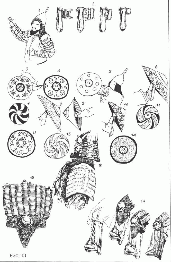 Таким образом, к XVI в. защита ног состояла из кольчато-пластинчатых набедренников - "бутлук", полусферических наколенников - "дызлык" и кольчужного сегмента подвешивавшегося к наколеннику и прикрывавшему голень (табл. 13: 17). Система "дызлык-бутлук" была настолько эффективна, что альтернативные варианты защиты ног (напр. попытка частичного возврата к ламинарной броне в кон. XV в (табл. 2: 1, 3) или внедрение железных наколенников, поножей и пластинчатых башмаков западно-европейского типа (табл. 1: 7) потерпели поражение и почти на всей территории Средней Азии были преданы забвению.