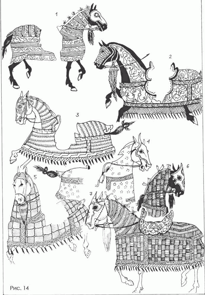 Панцирная попона держалась на теле коня при помощи двух ремней, перекрещивающихся на спине. Для предохранения лошади от потертости ремнями под завязки вдоль линии гривы укладывали толстую ткань (табл. 14: 1, 6). Под железную попону или конский доспех из твердой кожи одевали тканевый "поддоспешник", который различим на части изображений конских лат (табл. 14: 13). Полосы ламинарных конских панцирей, пластинки кольчато-пластинчатых конских нагрудников и поверхность тканевых попон украшались цветочным и геометрическим орнаментом (табл. 14: 1, 2, 10). Вдоль кромки панцирных сегментов часто шла полоса из ярких тканей с рисунком (табл. 14: 1-12).