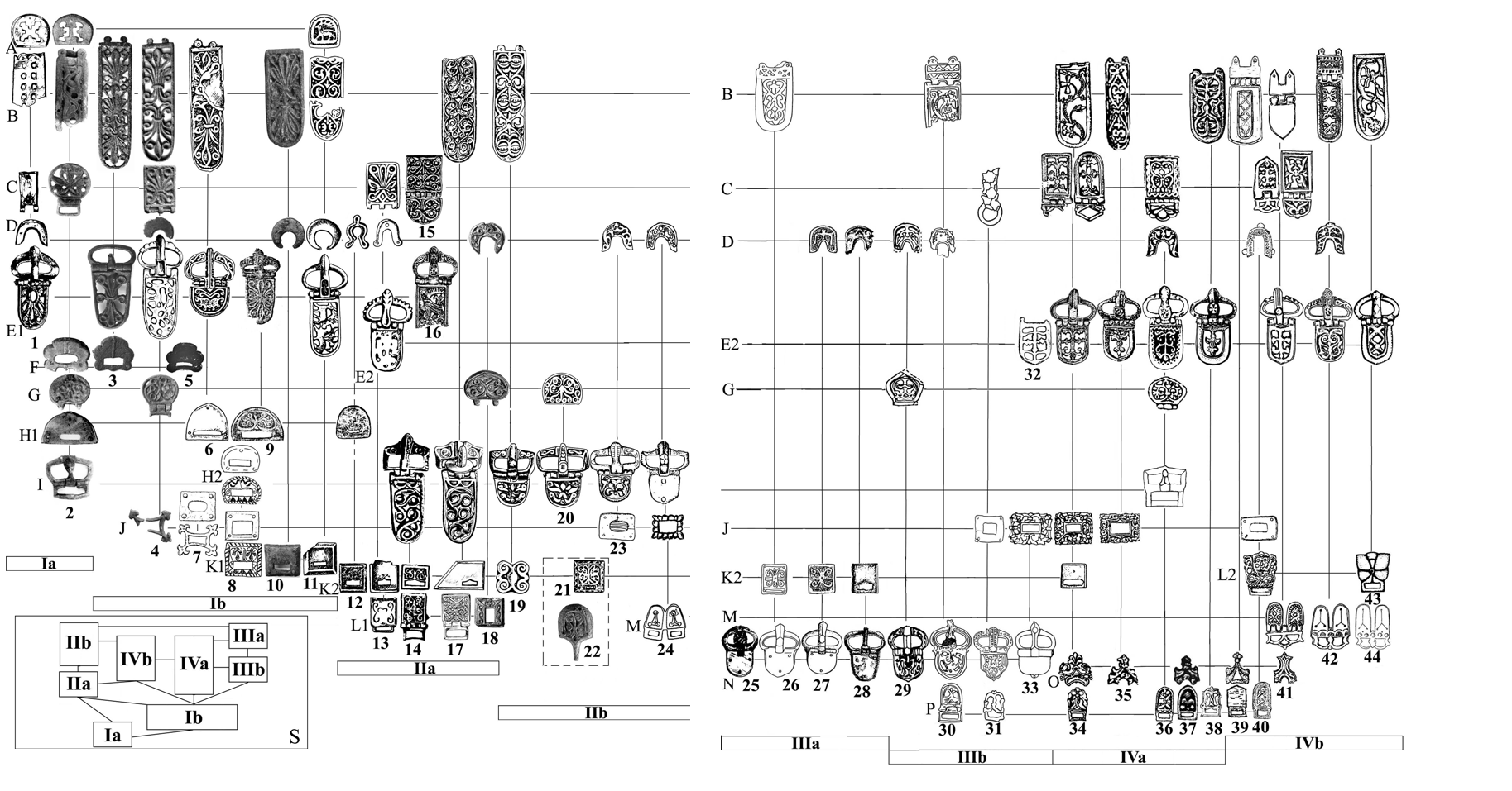 Если от группы Iа до IIb в таблице (рис.5) наблюдается классическая «диагональ» с хронологической нагрузкой, ситуация с группами IIIa-IVb оказывается гораздо сложнее. Группа ІІІа по конструкции щитка пряжек и составу пояса близка группе IIb, меньше Па, в то время как группа IIIb по декору и поясным деталям находит аналогии в группе IVа, судя по пряжке Е2 из п.5 к.8 Новинок II и «килевидной» шарнирной бляшке из к.1 Романовского I, начинающую свое развитие не позже стадии группы IIa. Весьма проблематична и аргументация асинхронности групп IVа и IVb. Трапециевидные бляшки из Столбища и к.7 Кугейская Падь III оформлены различно, и если бляшка из к.7 Кугейская Падь III (рис.5, 43L2) выполнена в «сред-несалтовском» декоре, то псевдошарнирные бляшки из Столбища (рис.5, 40L2) и п.6 Песчанки (ОАК за 1898 г. Рис.37) – в растительном декоре, аналогичном поясным деталям из п.2 к.5 Подгорненского V, п.2 к.1 Саловского I и к.1 Романовского I. В последнем погребении такая декоративная схема сочетается с мелким растительным декором сумочных рамчатых бляшек (также п.1 к.2 Обозного, п.1 к.6 Веселовского I) (рис.5, 33-35J). В аварском погребении 1882 г. из Keszthely (Szoke, 2001. Kep.5, 1) в таком стиле выполнен весь поясной набор, включая трапециевидную бляшку; в аварских п.36, 72, 134 Комарно (Komarom-Hajogyar) (Szoke, 2001. Kep.14, 1-3) трапециевидные бляшки украшены растительным декором, очень близким оформлению поясного набора из к.1 Романовского I; а аналогии фигурной бляшке из п.2 к.1 Саловского I (рис.5, 34О) в п.38, 124 Szeged-Kundomb (Szoke, 2001. Kep.4, 2, 5) входят в поясные наборы с декоративными элементами группы IIа. Однотипные шарнирные наконечники из п.14 Старокорсунской, п.2 к.1 Саловского I и к.7 Кугейская Падь III связывают сразу три группы IIIb, IVa, IVb; а подковообразные бляшки из п.2 к.5 Подгорненского V и к.1 Романовского I – группы IIb и IVa.