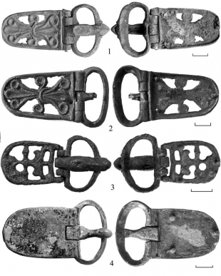 Пояс из п.2 к.22 Брусян II выглядит наиболее архаичным, хотя аналогичные бляшки с Х-видной прорезью в п.139 Крюково-Кужновского могильника сочетались на одном поясе с пряжкой с трапециевидной рамкой и разнообразным набором литых раннесалтовских бляшек: гладких, с декором «объемной перевязанной пальметтой» (ср.: рис.3, 7), извивающимися стеблями с пальметтами (очень близкими декору костяных пластин из п.11 Мешоко и чуть дальше – п.1 к.2 Брусян IV), частыми завитками без листьев в «облегченном» стиле Эрзеке (рис.5, 2). В последнем стиле украшен поясной наконечник из кат.79 Дмитровки, сочетающийся с пряжкой и бляшками горизонта Галиат-Геленовка (плетнева, 1989. Рис.86). пряжка из п.2 к.22 Брусян II (рис.3, 10) выполнена с характерной раннесал-товской сегментовидной рамкой, но декор ее щитка имитирует оригинальный византийский сюжет .