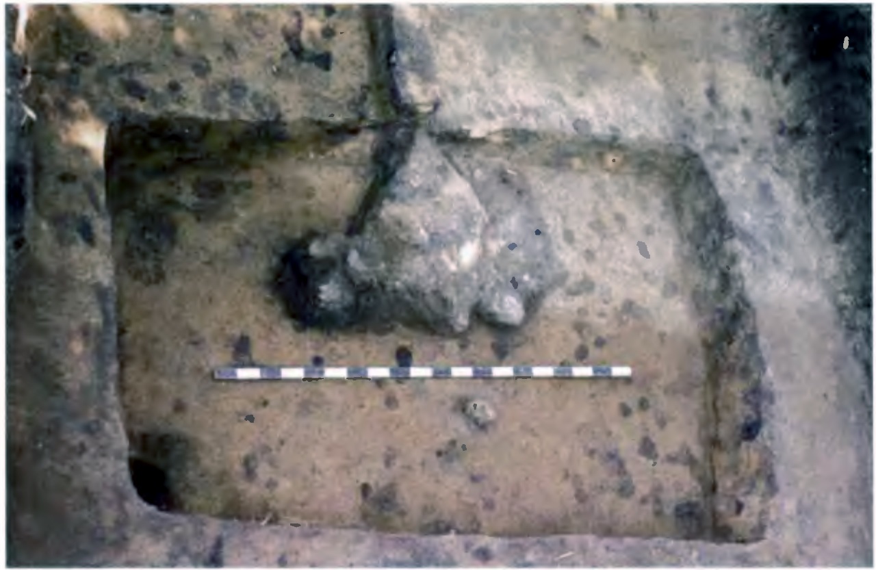 Погребение 162. Обнаружено в квадратах А-9-10. Зафиксирована нижняя часть ямы. Она имела прямоугольную форму и была ориентирована длинной осью по линии ЗСЗ-ВЮВ. Яма имела широкие заплечики вдоль длинных сторон (рис. 48). Прямоугольная погребальная камера была ориентирована своей длинной осью вдоль длинной оси ямы. Кости погребенного не сохранились. Инвентаря нет.