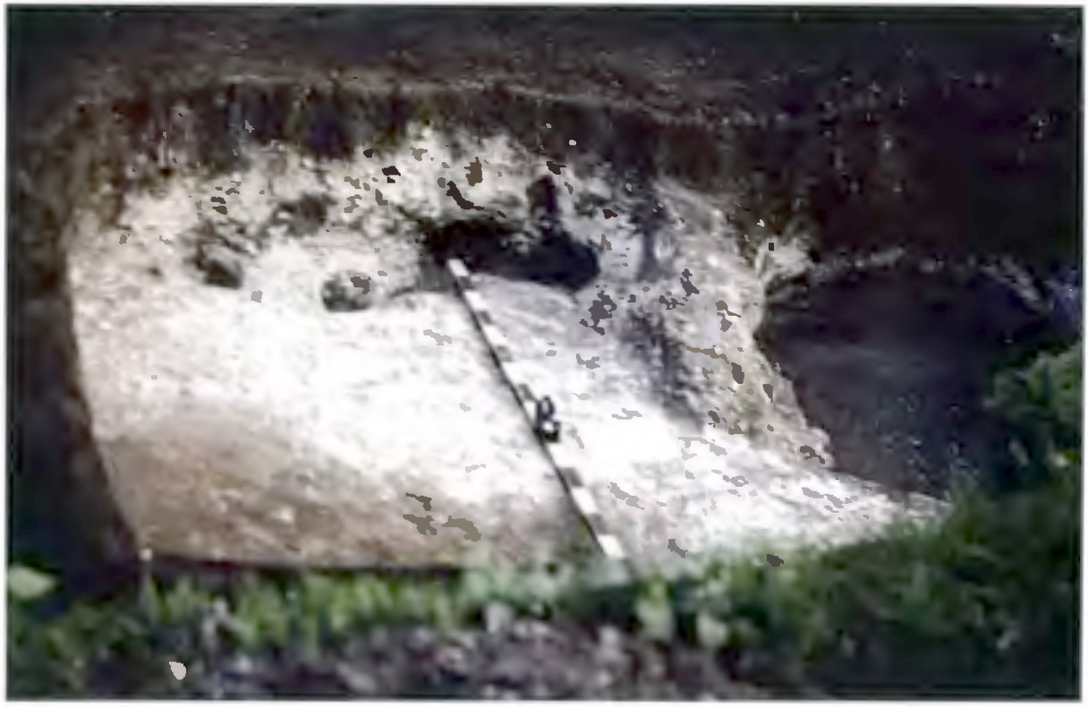 Погребение 182. Расчищено в квадрате А-9. Представляет собой совсем маленькую ямку прямоугольной формы (0,35x0,15 м). Она входила в ряд могил и имела одинаковую с ними ориентировку. Ее характерное черное заполнение, идентично по фактуре заполнению большинства могильных ям. Расчистка показала, что ямка была углублена в полотно дороги на 0,09 м (от СП - 0,39 м) (рис. 56). Каких-либо костных останков в ней не было зафиксировано. Возможно, это было захоронение выкидыша или какой-то части тела ребенка. Инвентаря нет.
