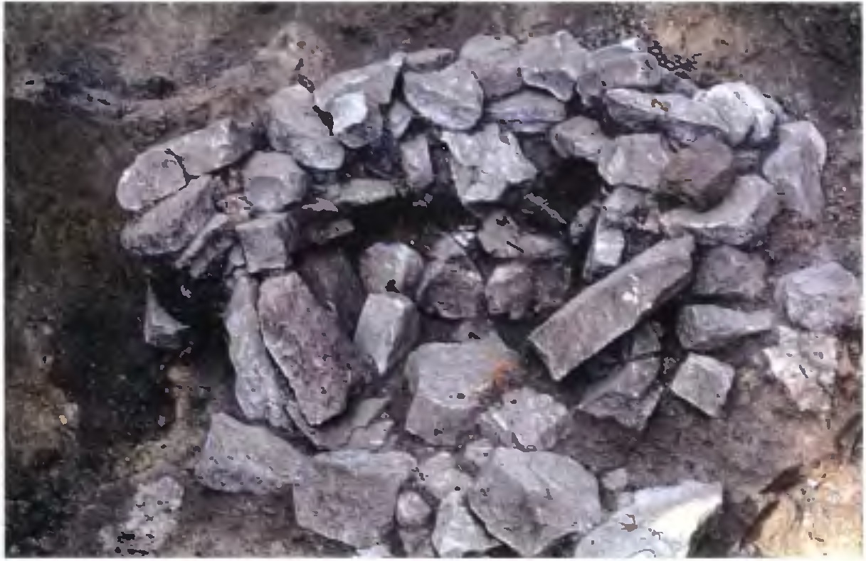 Погребенный был уложен вытянуто на спине, головой на запад. Череп лежал лицевой частью вверх. Руки вытянуты вдоль туловища, кисти находятся под крыльями таза. Правая нога чуть согнута в коленном суставе и завалена на правый бок. Левая нога лежит прямо. Стопы сведены вместе. С правой стороны у нижних ребер на дне могилы лежал маленький обломок медного предмета. Между костей таза вертикально, с небольшим наклоном стоял оселок из зеленого камня6.