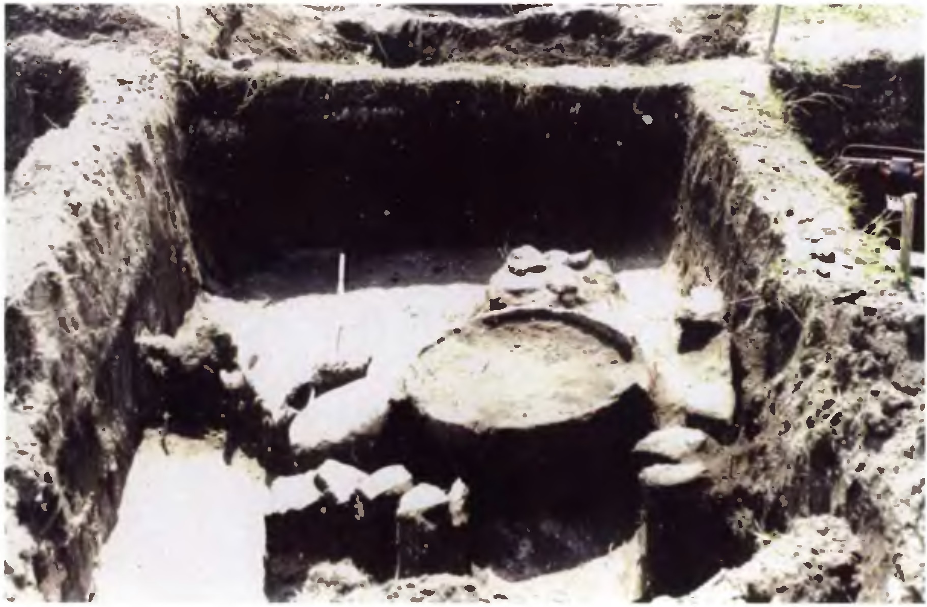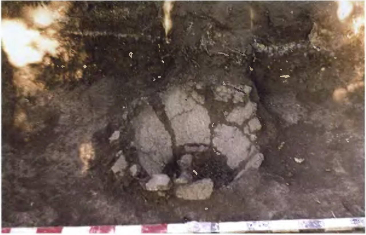 Интерес представляют отмостки из керамических фрагментов, которые были расчищены в раскопах 7, 9,10. В двух случаях (раскопы 7 и 10) они прилегали к вкопанным в землю нижним или верхним частям пифосов. При этом, в нижней части было выбито дно, а верхняя поставлена на венчик. Данные сооружения напоминают своеобразные санузлы – “ташнау”, служившие для слива воды. Они широко были распространены на территории Средней Азии и на значительных пространствах Восточной Европы, где они фиксируются, начиная с позднекочевнического времени (Васильев Д.В. и др., 2003). Так как исследованные нами сооружения, скорее всего, располагались под открытым небом, отмостки в их районе, по всей видимости, служили для удобства подхода к ямам, стенки которых были облицованы нижними или верхними частями сосудов.