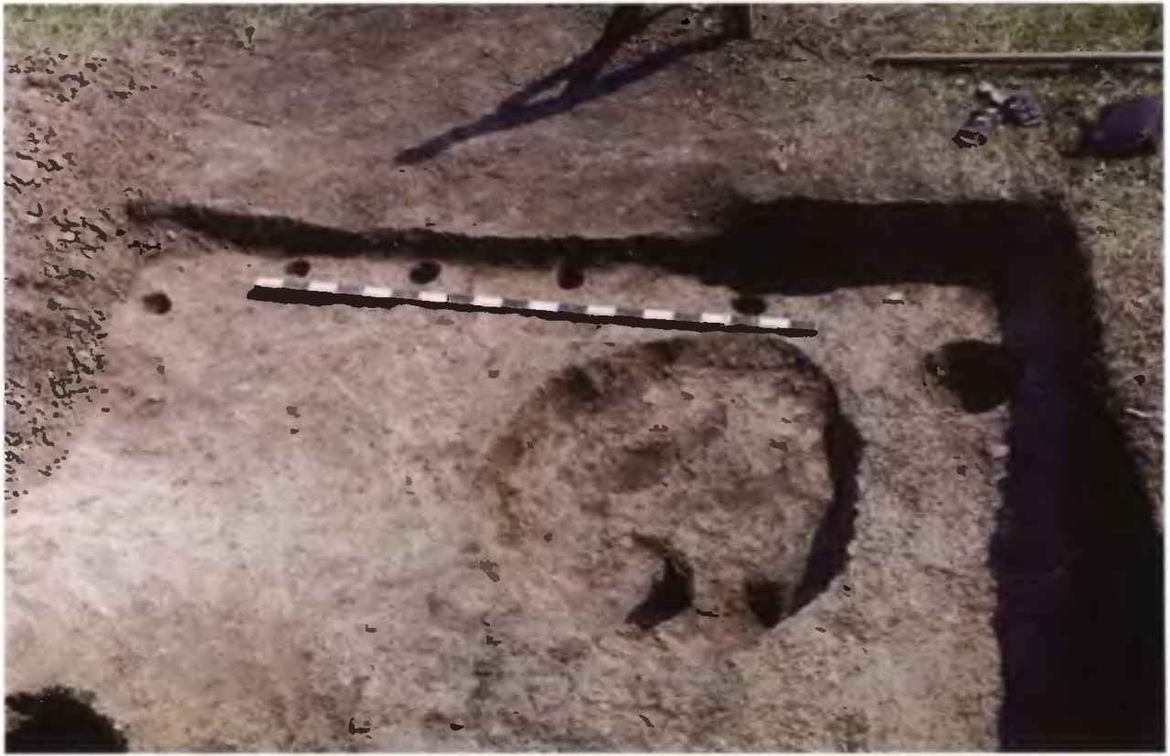 Стратиграфическая ситуация на данном участке была следующая. Верхние слои на 0,1 м представляли собой дерн. Ниже, до уровня -0,5-0,6 м, шел слой гумуса. На уровне -0,6 м он начинал светлеть за счет наличия в гумусе шины и на уровне -0,8 м плавно переходил в материковый суглинок.