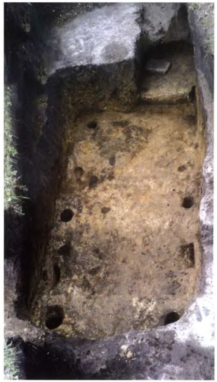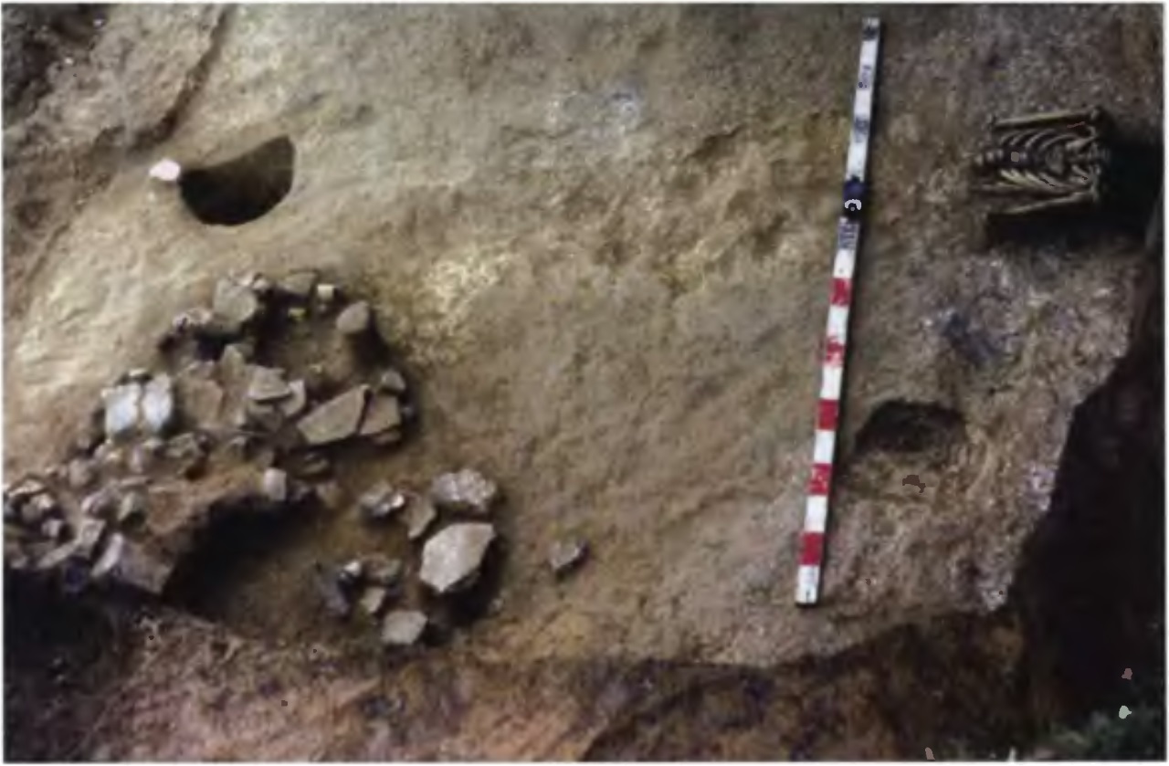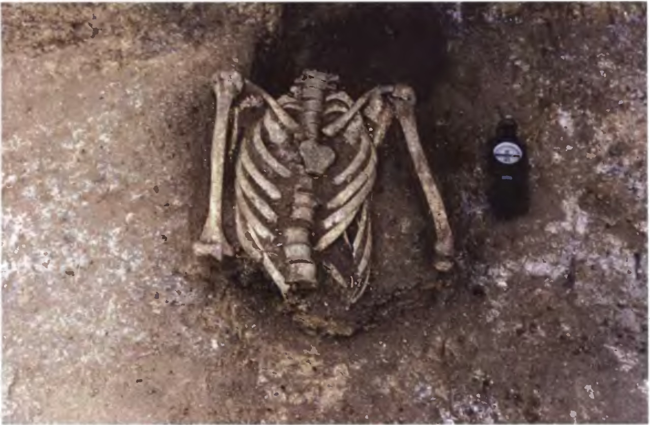 Пол постройки представлял собой натоптанную площадку, покрытую слоем угольков и золы на толщину 0,5-1 см. За счет этого он прекрасно фиксировался. У столба 1 на полу постройки лежала центральная часть человеческого скелета (рис. 78-79). Непотревоженными сохранились позвоночный столб, грудная клетка, плечевые кости рук с лопатками, ключицы. Собственно, не хватало тех костей, которые лежали чуть выше в заполнении над скелетом. Шейные позвонки погребенного находились на уровне восточного края столбовой ямы 1. Создается впечатление, что покойник был уложен вдоль матицы, опираясь о центральный столб постройки. В дальнейшем, когда котлован уже начал обваливаться, части тела человека был растащены землеройными животными. По всей видимости, указанное помещение относится к последнему этапу существования городища, связанному с разгромом и гибелью населенного пункта.