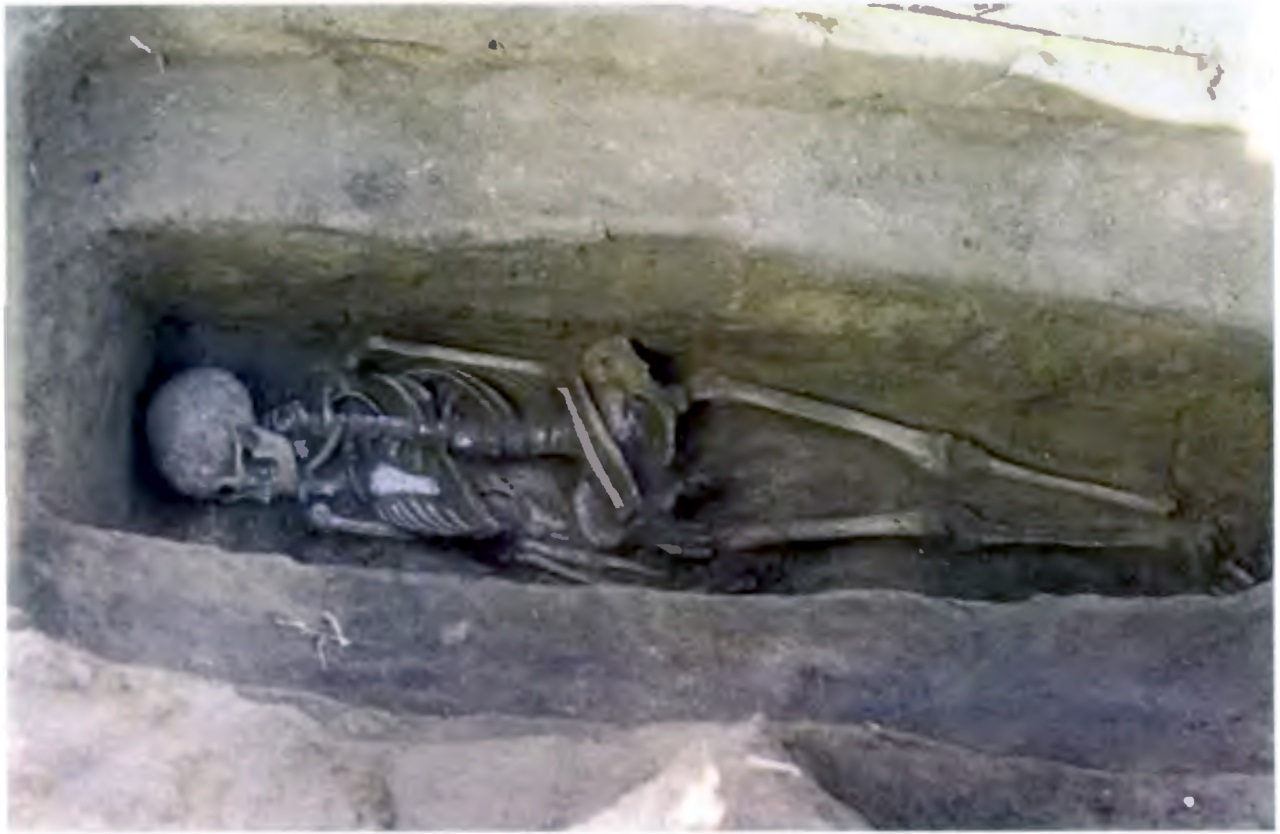 Интересно погребение, обнаруженное в хоз. яме 1 р.7. Это уже второй комплекс, найденный на данном памятнике. Первое погребение было расчищено в 2000 г в заполнении котлована помещения 3 (Кравченко Э.Е., Давыденко В.В., 2001, с.2-37, рис.5, 1). Подобные комплексы исследовались на ряде памятников салтово-маяцкой культуры. Они встречены в Саркеле (Артамонов М.И., 1958, с.27, рис.15; Артамонова О.А., 1963, с.11-20), на Маяцком селище (Винников А.З., Афанасьев Г.Е., 1991, с. 118-130), при раскопках посада (р.1П) расположенного в среднем течении Северского Донца, неподалеку от Сидоровского археологического комплекса, городища у с.Маяки (Царино городище) (Швецов М.Л., Кравченко Э.Е., 1990). О том, что погребенный был именно уложен, а не просто брошен в яму, свидетельствует ряд факторов. Так, в нижней части ямы имеется глинистая подсыпка, полностью лишенная каких-либо находок. Именно на ней и был уложен покойник. Обращает внимание тот факт, что большинство погребений в круглых ямах Саркела-Белой Вежи также имели подсыпку (Артамонова О.А., 1963, с.19). Тем не менее, поза, в которой лежал скелет в хоз. яме 1 р.7 (собственно, как и ряд скелетов в могильнике Саркела) свидетельствует, скорее всего, в пользу насильственной смерти погребенного. После яма была засыпана мусором, представляющим собой продукт деятельности очага (золистый грунт, насыщенный горелыми костями животных и фрагментами керамики, также побывавшими в огне).