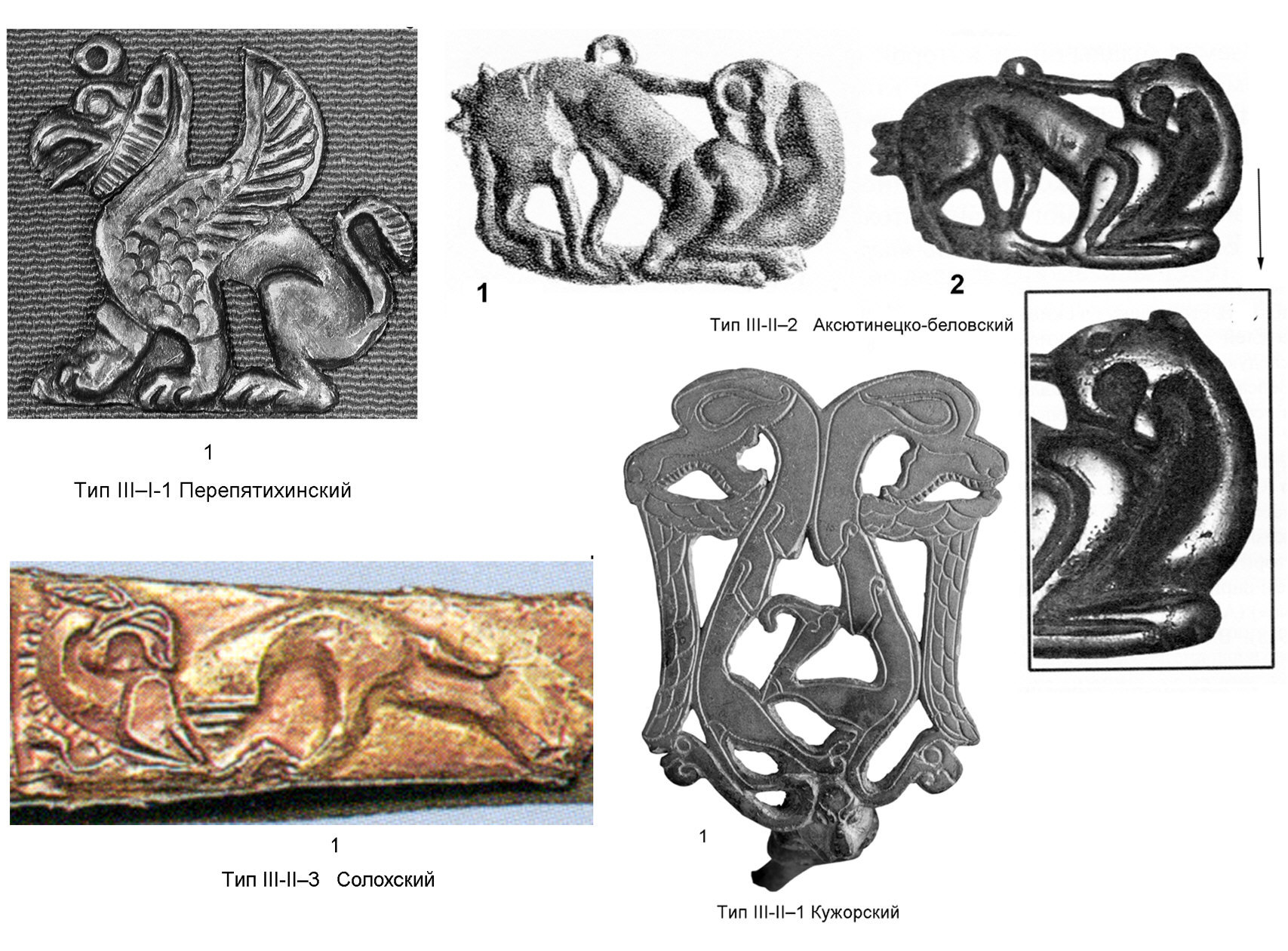 1 - курган Перепятиха у с. Марьяновка (по: Piotrovsky B., Galanina L., Grach N. Scythian Art. Leningrad, 1986. Fig.22). Тип III-II–1 Кужорский: 1 - станица Кужорская, курган 1 (по: Канторович А.Р., Эрлих В.Р. Указ. соч. Кат.89). Тип III-II–2 Аксютинецко-беловский. 1 – Аксютинцы, курган 2, раскопки С. А. Мазараки 1883-1885 гг., (по: Бобринский А.А. Курганы и случайные археологические находки близ местечка Смелы. Т. 2: Дневники раскопок 1887–1889 гг. СПб., 1894. Табл. XXIII, 6, 7); 2 - Беловский р-н Курской обл., предположительно окрестности с. Гочево, случайная находка (по: Шпилев А.Г. Зооморфные украшения скифского времени из Курской области // Древности Днепровского Левобережья от каменного века до позднего средневековья (к 80-летию со дня рождения А.И. Пузиковой) // Материалы и исследования по археологии Днепровского Левобережья. Вып.4. Курск, 2012. Рис.3: 3). Тип III–II-3 Солохский: 1 - Солоха, Боковое погребение (по: Манцевич А.П. Указ соч. Kат.44)