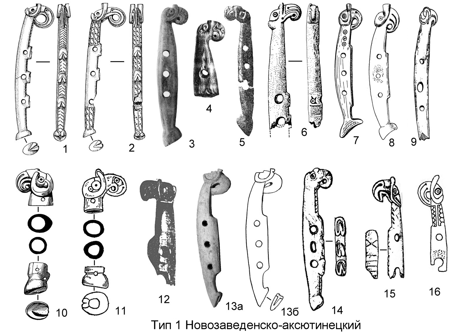 Тип 1 Новозаведенско-аксютинецкий объединяет 16 оригинальных изображений, происходящих преимущественно с территории Среднего Поднепровья (3-9, 11, 14-16), а также из Центрального Предкавказья (1, 2, 13) и Прикубанья (10). Все эти изображения оформляют элементы конского снаряжения - трёхдырчатые костяные/роговые псалии (1-9, 12-16) и костяные насадки на деревянные псалии (10, 11)[128]. Моделировка объемная, детали рельефные, при этом изображения рассчитаны на профильное обозрение - в одних случаях двустороннее, в других одностороннее.