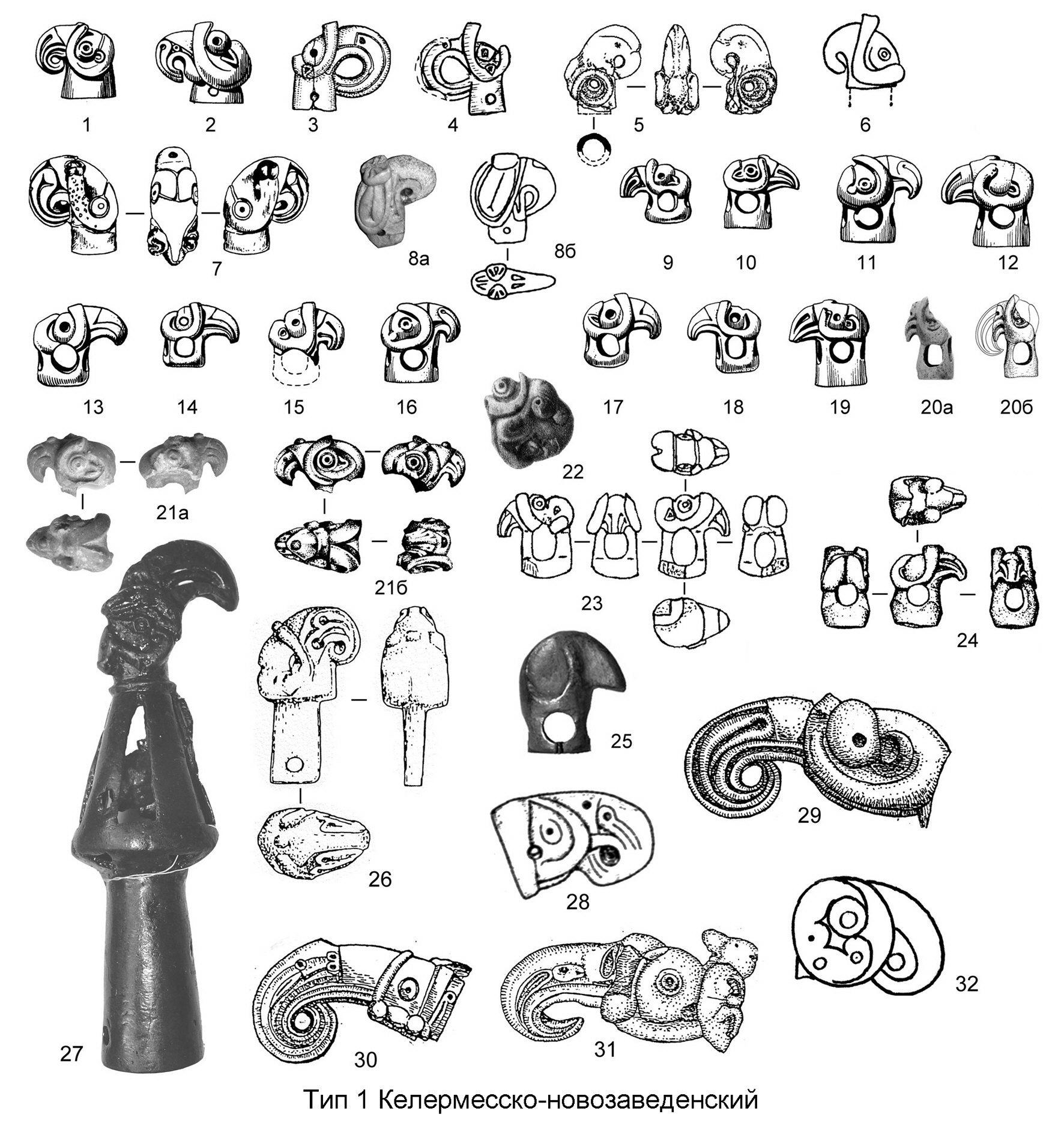 Тип 1 Келермесско-новозаведенский объединяет 32 оригинальных изображения, происходящих преимущественно с территории Прикубанья (1, 2, 9-19, все - из Келермесских курганов), Ставрополья (3, 4, 20, 21, 26, 30) и Среднего Поднепровья (6-8, 22-25, 27), в меньшей мере из Нижнего Поднепровья (29), Крыма (31) и Нижнего Подонья (5, 28, 32). Большинство из этих изображений оформляют элементы конского снаряжения - костяные навершия деревянных псалиев (1-8), костяные столбики-распределители уздечных ремней (9-25); реже это костяные налучья (28-32) и бронзовые навершия (27), а также костяная насадка со шпеньком неясного назначения (26) . Моделировка скульптурная, рассчитанная на объемное обозрение.