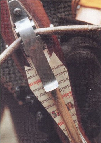 Короткие арбалетные болты имели деревянное или пергаментное оперение. Здесь оперение вырезали из пергамента трофейной книги. Плоская пружина удерживает болт на месте. Нажатие па спусковой крючок освобождает рычаг, который отпирает пружину.