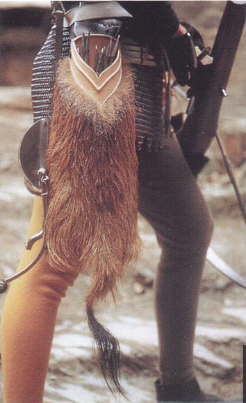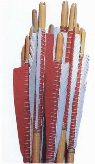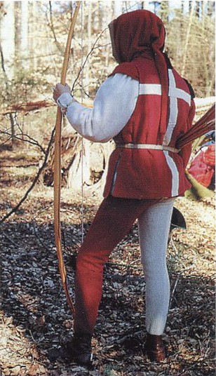 «Свободный лучник» носит французскую ливрею с капюшоном поверх красно-белого камзола и рейтуз. Детали хвостового оперения стрелы. Оперение подклеено и привязано льняной нитью. Зарубки на заднем конце стрел усилены костяными вкладышами. Цветное перо позволяло правильно ориентировать стрелу при выстреле.