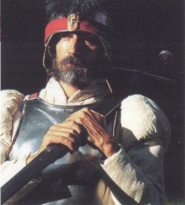 Бородатый офицер-арбалетчик в шлеме, украшенном тюрбаном, плюмажем и бычьей головой – гербом кантона Ури. Бороды противоречили католическим канонам, полному их ношение ограничивалось отдельными периодами в истории. Но брили бороды сравнительно редко, где-то раз в неделю, а в походе и того реже. Некоторые принимали обет не бриться. Например, такой обет давал Карл Смелый. Бородатые мужчины фигурируют на иллюстрациях на библейские темы, иногда бородатыми рисовали и солдат. Известен рассказ об одном сержанте, которого оттаскали за бороду в ходе драки в кабаке в Вильер-ле-От.