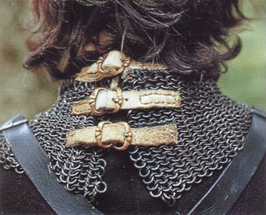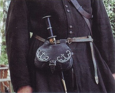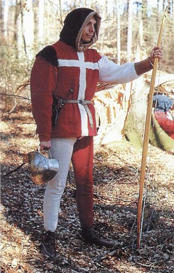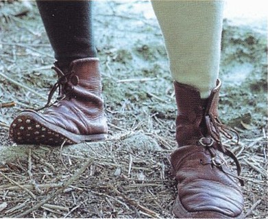 Для защиты шеи обычно использовался кольчужный воротник Воротник имел матерчатую подкладку и застегнется па ремни с пряжками, пуговицы или крюки сбоку или сзади. Каждому приходится носить с собой личные вещи: деньги, к ночи, ножик и ложку, носовой таток, гребешок и т.п. В средние века все это носили в кошеле, который подвешивался к поясному ремню. Непосредственно к поясному ремню предметы вешали очень редко. Но солдаты даже кошельки редко носили на поясе. Все, что открыто висит на поясе, может быть легко украдено или потеряно. Поэтому кошельки скрывали под одеждой. Женщины часто помещали кошельки между рубахами или юбками. Металлические украшения пользовались популярностью. Их масса удерживаю клапан в закрытом состоянии, В простейшем случае использовались оловянные и медные украшения. Состоятельные люди могли себе позволить отделку из серебра и золота. В начале XVI в. в одной книге упоминается список вещей, какие слуги должны всегда держать наготове, если хозяин вздумает отправиться в путешествие: «кошель, кинжал, плащ ночной котик, постой шаток, рожок для обуви, бумажник, туфли, копьё, мешок, капюшон, недоуздок, чепрак, шпоры, наяну, гребень для гривы, лук, стрелы, меч, баклер, перчатки, тетиву, нарукавник, ручку, бумагу, чернила, пергамент, красный воск, ластик, книги, перочинный нож, гребень, наперсток, иглу нитку, запасные ремешки, шило, нож, бритву». Высокие ботинки с подбитой гвоздями двухслойной подошвой. Ботинки застегиваются двумя ремнями с пряжками и шнурками.