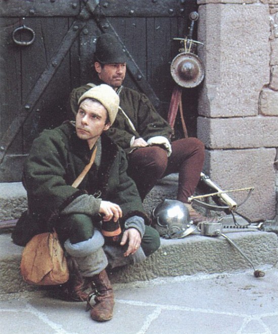 Во время Столетней войны и первое время после ее завершения французская земля кишела безработными наемниками. Эти двое носят одежду путешественников. Все что они умеют - заниматься войной. Это опытные и опасные люди, они ищут кого-нибудь, кому можно предложить свои услуги. С собой они носят свое оружие. Обратите внимание па кранекин арбалетчика. На рукоятке меча висит небольшой щит-баклер, о котором упоминает Манчини. Наемники движутся по территории, па которой действуют банды бывших солдат, которые вступают в стычки с местными крестьянами и друг с другом. Побежденным бесполезно молить о пощаде.