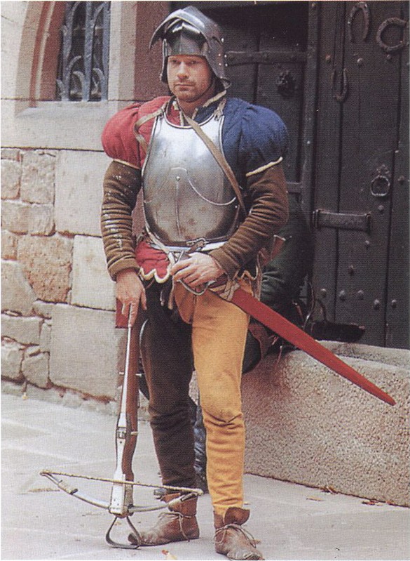 Этот аркебузир служит в гарнизоне небольшого и ветхого замка Вомарк в Швейцарии. В конце февраля 1476 г. он ведет разведку в окрестностях замка. С юга слышна канонада в районе Грандсона, где бургундская армия Карт Смелого штурмует замок, удерживаемый бернским гарнизоном. Земли Рудольфа фон Хохберга, графа Невшателя лежат па границе между владениями Берна и Бургундией. Граф старался сохранять нейтралитет, но мирные переговоры 1475 г. шили в тупик, удалось добиться всего месячного перемирия. Армия швейцарской конфедерации выступила на помощь Грандсону, а бургундцы выдвинулись к замку Вомарк, принадлежавшему фон Хохбергу. Комендант замка получил приказ капитулировать при малейшей опасности, но ситуация оставалась неясной. Интересен был исход противостояния конфедерации и Бургундии. В небольших замках вроде Вомарка ни у кого ни от кого секретов нет, потому все разделяют беспокойство коменданта: чья сторона возьмет? Как известно, замок Вомарк взяли бургунды, но буквально через несколько дней 2 марта 1476 г. швейцарская конфедерация одержала экстраординарную победу при Грандсоне. Швейцарцы сожгли Вомарк, предварительно полностью разграбив его, вынеся все, вплоть до оконных переплетов.