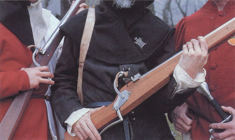 Солдаты и горожане постоянно несли караул, днем и ночью, обходя лагерь или городские стены, освещая окрестности фонарями и спрашивая у проходящих пароль. В плохую погоду Бургундский аркебузир в фетровой шляпе и караульные заворачивались в мантии, плащи и капюшоны, некоторые из них специально шили для караульной службы. Здесь наш стрелок из Невшателя зажигает фитиль от фонаря у степы Вомарка.