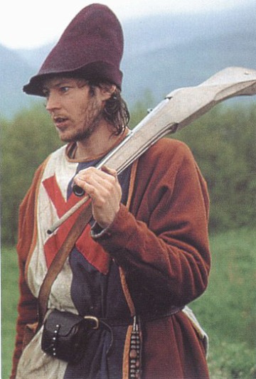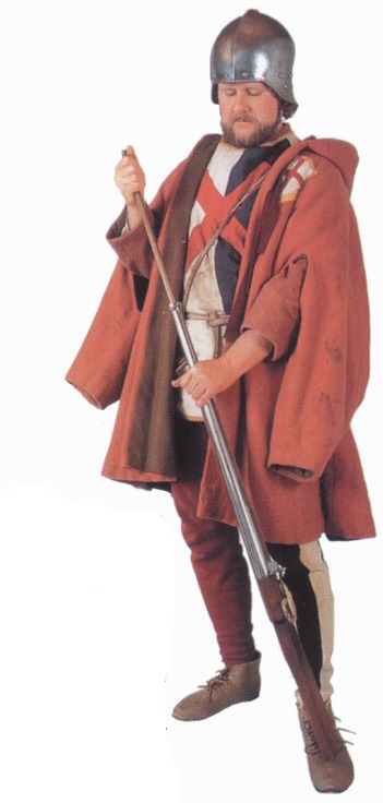 Стрелок в простои, но толстой суконной мантии, менее громоздкой нежели плащ. Рукава с прорезями позволяют выпускать руки при стрельбе и работе. Под мантией поддета бургундская ливрея.