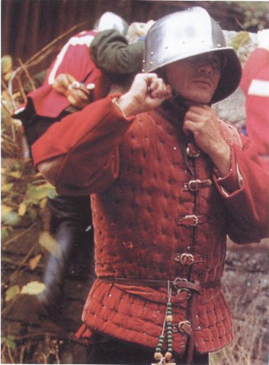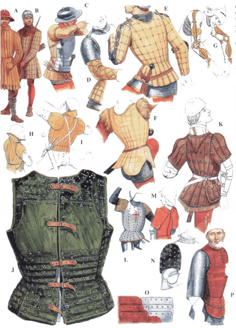 (B) Писатели XV в. упоминают о характерных «мягких» куртках английских солдат, достигавших колен. В 1483 г. солдаты герцога Глостера носили куртки, «набитые пенькой... Чем мягче куртка, тем лучше она держит удар стрел и мечей». Фуке изображал иехотинцев в длинных стеганых гамбезонах, которые иногда носили под кольчугами. Более поздний фламандский художник Мемлинг изображал облегающие куртки модного покроя.