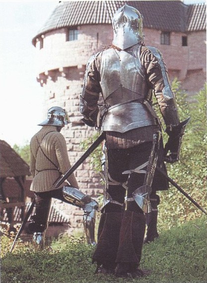 В 1460-70-х гг. многие германские и швейцарские города формировали небольшие отряды самообороны. В тяжелые времена жители предпочитали платить отступные, нежели служить самим. Опытных воинов, вооруженных полутораручными мечами, охотно брат па службу Во время войны кроме меча использовались алебарды. Германия и Швейцария еще не существовали как отдельные независимые государства, поэтому лояльность наемников определялась прежде всего получаемым ими жалованьем. Воин носит одежду из качественной ткани. Его доспехи состоят из саллета с забралом, кирасы и перчаток. Поверхность доспехов рифленая. Доспехи хорошо подогнаны, их толщина разнится, достигая наибольшей величины на наиболее уязвимых участках. Саллет выкован из цельного куска металла, при этом имеет изящные очертания. Доспехи перевозили, обернув в одеяла, или обложив соломой в бочках или корзинах. В походе доспехи требовали постоянного ухода. Порванные ремни, поломанные пряжки, сорванные заклепки немедленно заменялись. Разрубленный плечевой ремень, не замененный во время, делал доспехи практически бесполезными.