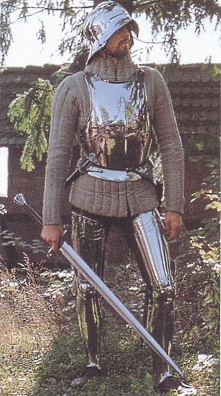 Это доспехи хорошо экипированного воина, несущего гарнизонную службу. Это конный воин, он верхом патрулирует дальние окрестности замка. При необходимости он может спешиться и участвовать в обороне замка. Доспехи простые, германского типа.
