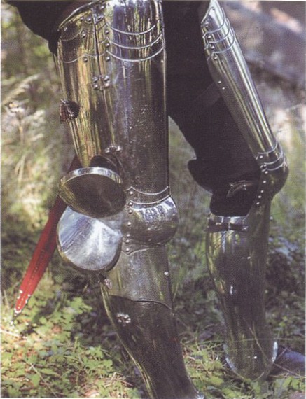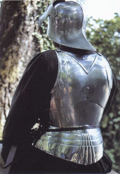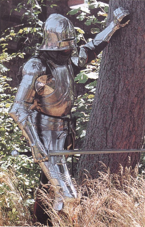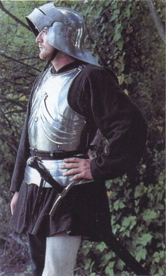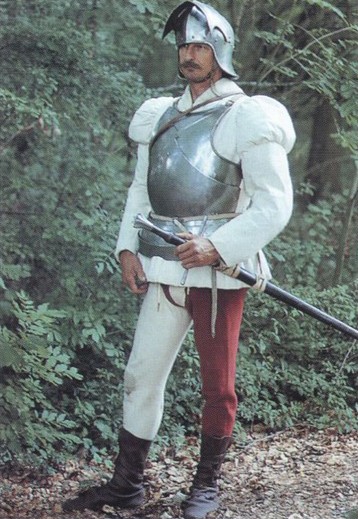 Доспехи и вооружение подбираются в соответствии с поставленной задачей. Полные доспехи можно было надеть только с посторонней помощью. Первым надевали кольчужный воротник, застегивающийся ремешками с пряжками сзади или сбоку. Облегающие кольчужные «шорты» привязывали к рейтузам ремешками. Надевали пластинчатые башмаки (sabetons). Затем надевали поножи, защищавшие голень. Далее следовали наколенники и набедренники, которые ремнями крепили к ноге, а также подвязывали к верхней части чулка. Нагрудная и наспинные пластины кирасы застегивали на правом боку с помощью ремней с пряжками. К кирасе подвешнвался налядвянннк. Оплечья н наручи привязывались к рукавам камзола и соединялись с руками ремнями с пряжками. Как правило, наручи состояли из четырех деталей: оплечья (pauldron), наплечника (rarebrace), налокотника (counter) и собственно наручи (vamhrace). Шпоры, шлем, меч и кинжал довершали экипировку.