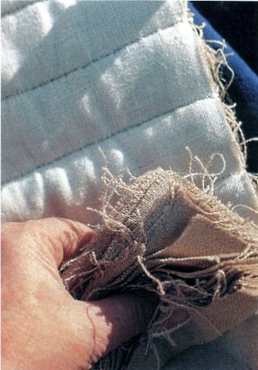 Описании фланелевого камзола (Е) говорится о дырчатой атласной подкладке. Дырки обшивались по периметру шнурком, что делало очень прочный и в то же время дышащий слой. Подобная техника временами упоминается в документах того времени. В одном германском тексте середины XV в. сообщается, что каждое отверстие дополнительно усиливаю латунное кольцо.