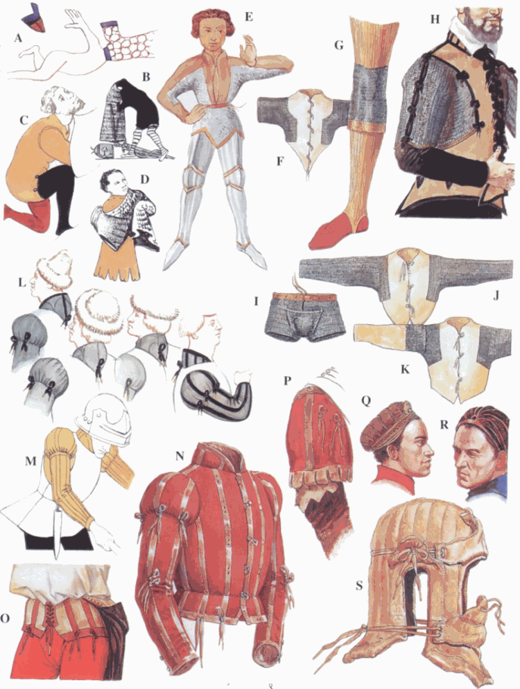 (Q и R) Стеганые подшлемники. В 1460-х гг. амортизаторы на подшлемниках укладывали концентрически или параллельно. Существует неверное мнение, что популярная в начале века стрижка «под горшок» служила «дополнительным амортизатором». В конце столетия в моду вошли длинные волосы, которые перехватывали сеткой.