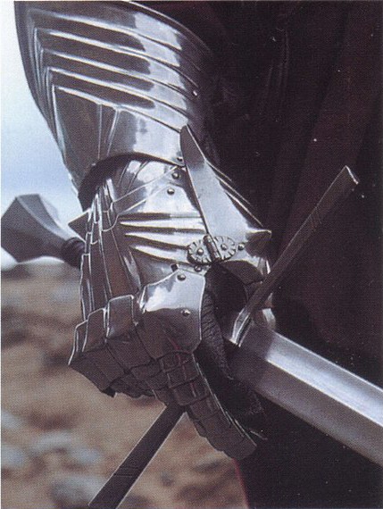 Мы хотим представить один великолепный комплект средневековых лат, изготовленных в Милане около 1450 г. В настоящее время комплект хранится в коллекции Баррелла. Доспехи кованы, чеканены и цементированы. Молот с приводом от водяного колеса широко использовался для выполнения черновой ковки. После того, как пластины в целом были выкованы, им придавалась нужная форма вручную. Мастер указывал точку, куда бил тяжелым молотом подмастерье. На протяжении столетий именно так передавалось кузнечное мастерство. Рыцари и капитаны носили очень дорогие и качественные доспехи. Вообще, доспехи выпускались в разных ценовых категориях, встречались на удивление дешевые подержанные комплекты, прошедшие ремонт. Однако больших переделок доспехов не делали, поскольку жизнь владельца напрямую зависела от того – насколько разные пластины подогнаны друг к другу. Изготовление доспехов было налаженным делом, удовлетворявшим самые разные требования интернациональной клиентуры.