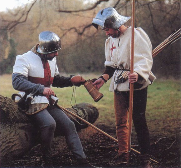 К середине XV в. многие дворяне, даже не будучи рыцарями, были достаточно состоятельны, чтобы обеспечить себя полным комплектом доспехов. Разного качества доспехи были доступны для покупателей разного уровня достатка. Латники теперь редко участвовали в бою верхом в роли ударной конницы или тактического резерва. Как правило, теперь сражения велись в пешем строю. Вооружение состояло из алебард и другого оружия с длинным древком. На снимке английские солдаты времен войны Алой и Белой Роз собираются вокруг штандарта, рядом с которым стоят капитан и барабанщик. Разные типы доспехов, некоторые воины поверх доспехов носят ливреи. Двое справа полностью экипированы, незащищенными остались лишь голени ног.