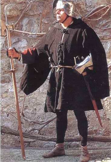 От непогоды в описываемый нами период защищались с помощью таких плащей. Плащи носили представители всех классов во время путешествий, верховых поездок, а также при передвижении по городу в дождь или снег. Среди солдат тащи также были весьма распространены. Короткие плащи считались модными и удобными для езды верхом. Плащи полной длины выкраивались из куска шерстяной ткани в форме сегмента в две трети круга В такой плащ можно было завернуться, полностью защитившись от холода и дождя. Плотная ткань плаща покрываюсь ланолином для дополнительной непромокаемости. Па груди плащи застегивались завязками или двумя-тремя пуговицами. На виде сзади видны глубокие складки и длинный хвост капюшона, хотя последняя деталь считаюсь к 1470-м гг. скорее старомодной.