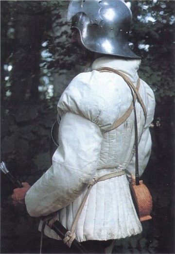 Справа: хорошо экипированный бургундский пеший воин носит гамбезон и железный нагрудник «германского» типа. Удобство гамбезона заключалось в том, что множество внутренних слоев ткани удерживалось на месте строчкой, а покрой гамбезона не сковывал движений. Известно множество упоминаний о такой одежде в источниках XV в., относящихся к Бургундии, Франции и Англии. Тщательная реконструкция доказала, что ношение гамбезона достаточно комфортно, он не ограничивает движений, обеспечивая неплохой уровень защиты владельцу. В районе плеч толщина гамбезона увеличена для защиты от рубящих ударов сверху вниз. Здесь толщина достигает 18 слоев ткани. В районе пояса толщина уменьшается. Гамбезон неплохо защищает человека сан по себе, даже без металлических доспехов. Следует отметить, что гамбезон многослоен даже в районе швов. Благодаря иной особенности, швы не менее прочные, чем остальная поверхность мягкого доспеха.